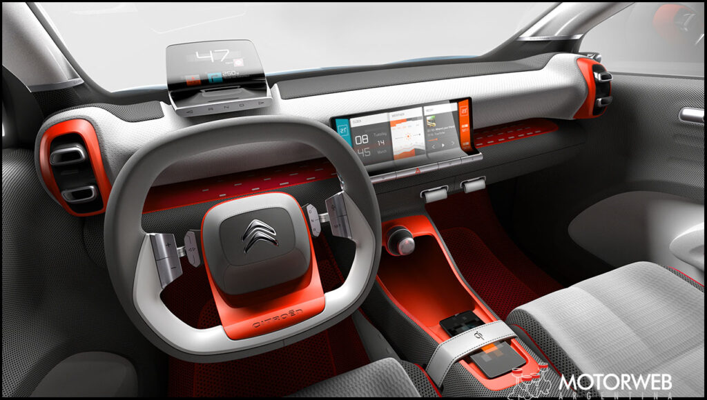 Los retrovisores se reemplazan con cámaras que enfocan hacia atrás, sumará un sistema de carga de celulares sin cable (por inducción, simplemente apoyando el teléfono sobre una superficie demarcada), y tendrá un volante de un solo brazo, retomando una tradición de diseño de volantes de la marca desde los años 50. En la consola central, una gran pantalla HD de 12 pulgadas concentrará todos los comandos y las informaciones, incluyendo la cámara frontal montada sobre le retrovisor central «Connected Cam», que filma en caso de accidentes y que la marca ya utiliza en autos de serie como el ultimo C3 europeo (ver lanzamiento aquí).