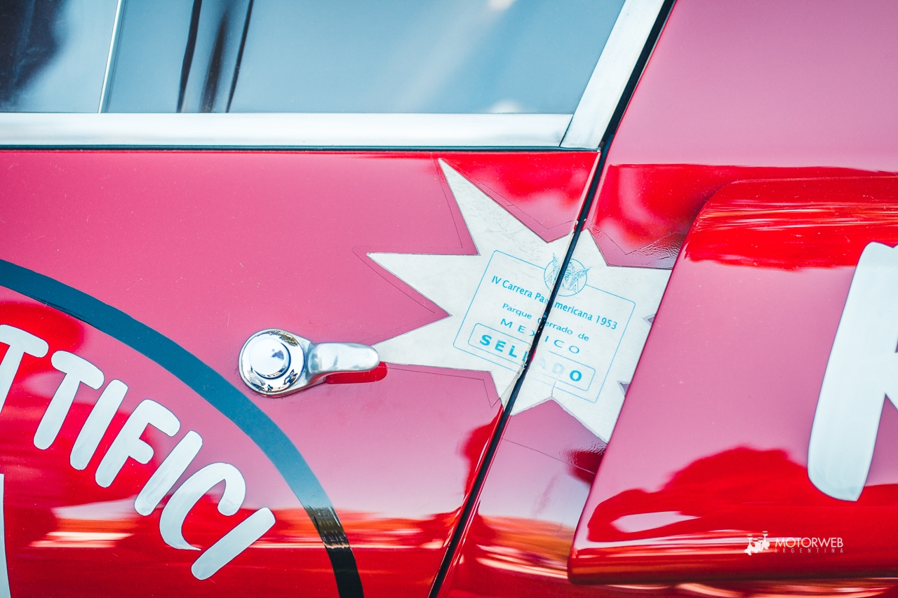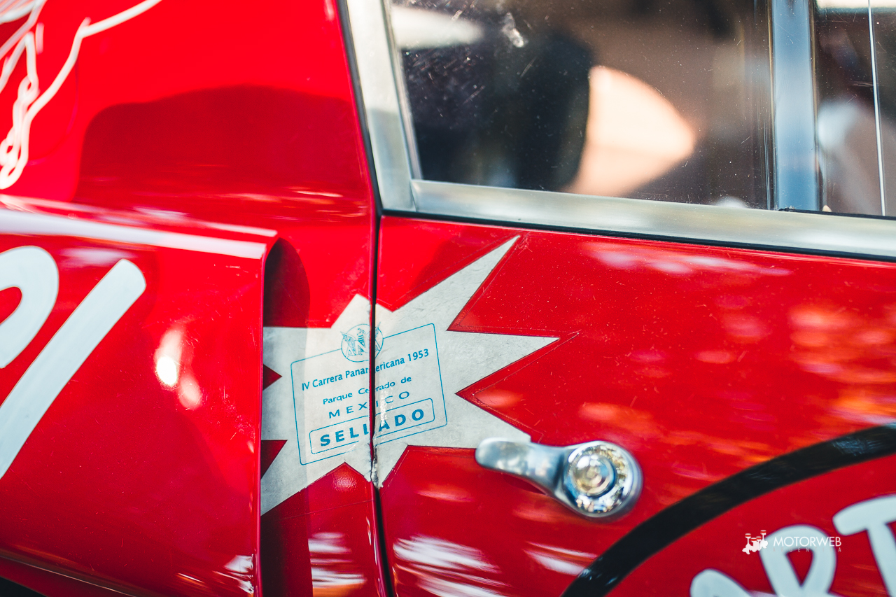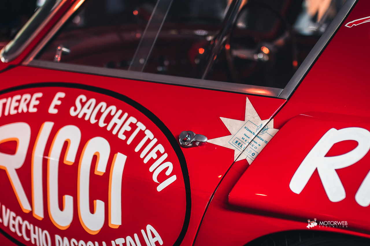 El auto posee actualmente el livery con el cual compitió en aquella Carrera Panamericana de 1953, incluídos los stickers originales de la organización, se conserva en un estado impoluto por el cual vale la pena quedarse viendo largo rato. Leyendo un poco encontramos que este vehículo pasó por varias manos importantes, incluídas las del mandamás de la F1, el mismísimo Bernie Ecclestone, que la tuvo a mediados de los años ’90; además de curiosidades como haber sido descalificada de las 12 horas de Reims en 1953 debido a circular por la noche sin luces, o que la denominación 375 se debe a que, tras la descalificación en Reims, el auto regresa a fábrica para reemplazar el motor por el V12 4.5 y 340 CV que posee actualmente -más allá de que según registros, en 1969 tras un choque frontal en los Estados Unidos, el motor fuera reemplazado por un V8 y el auto aparezca en un desarmadero-