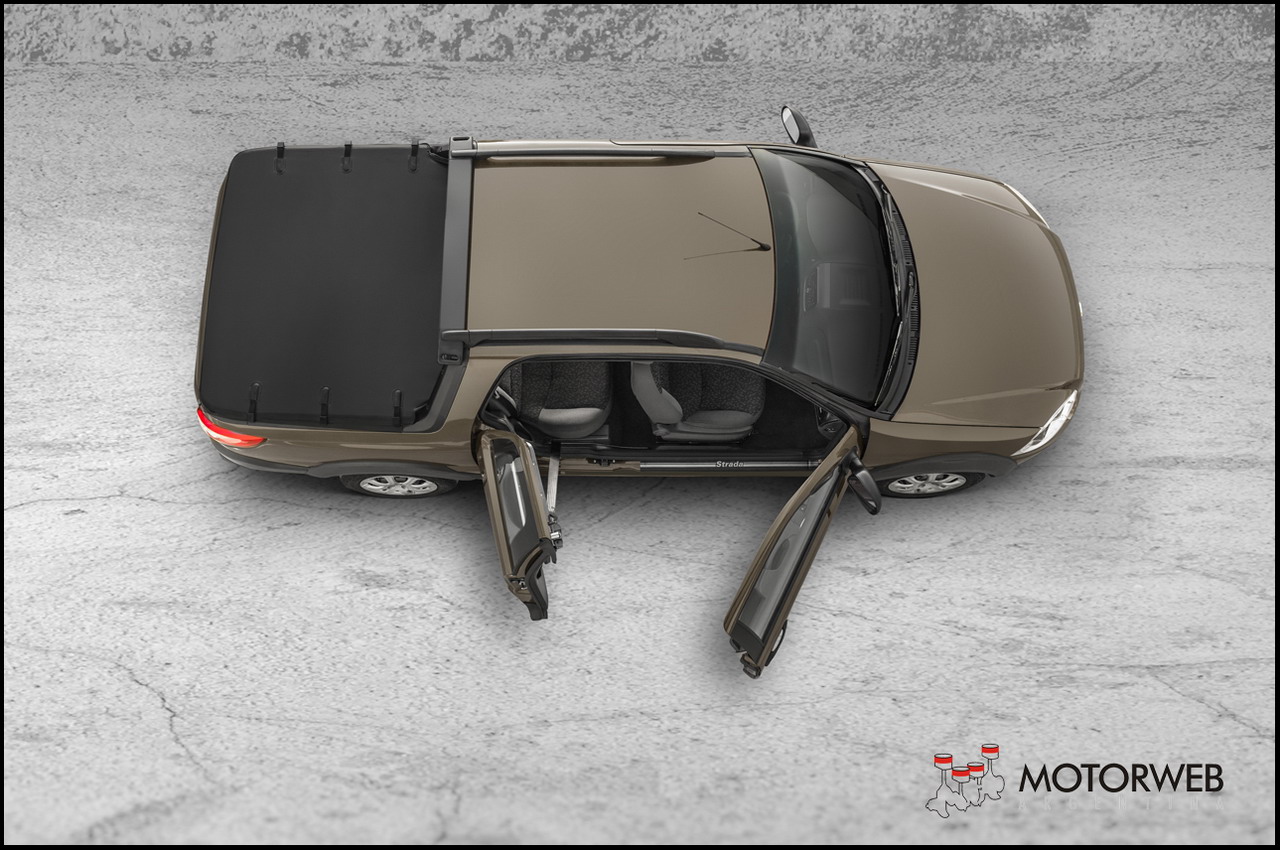 Además, la Nueva Strada presenta un moderno rediseño en su vista posterior, con nuevas ópticas y paragolpes, y una línea de cintura más elevada que contribuyó a aumentar la capacidad volumétrica de la caja de carga, siendo ahora la mayor dentro de las pick-ups livianas. El nuevo modelo incorpora también novedades de equipamiento, como ser el asiento de conductor regulable en altura, la apertura remota de tanque de combustible, sensores de lluvia y crepuscular, espejo electrocrómico, entre otros.