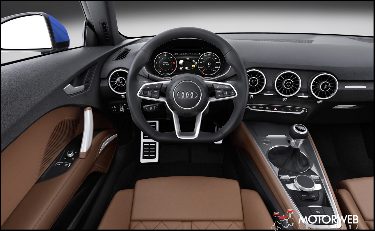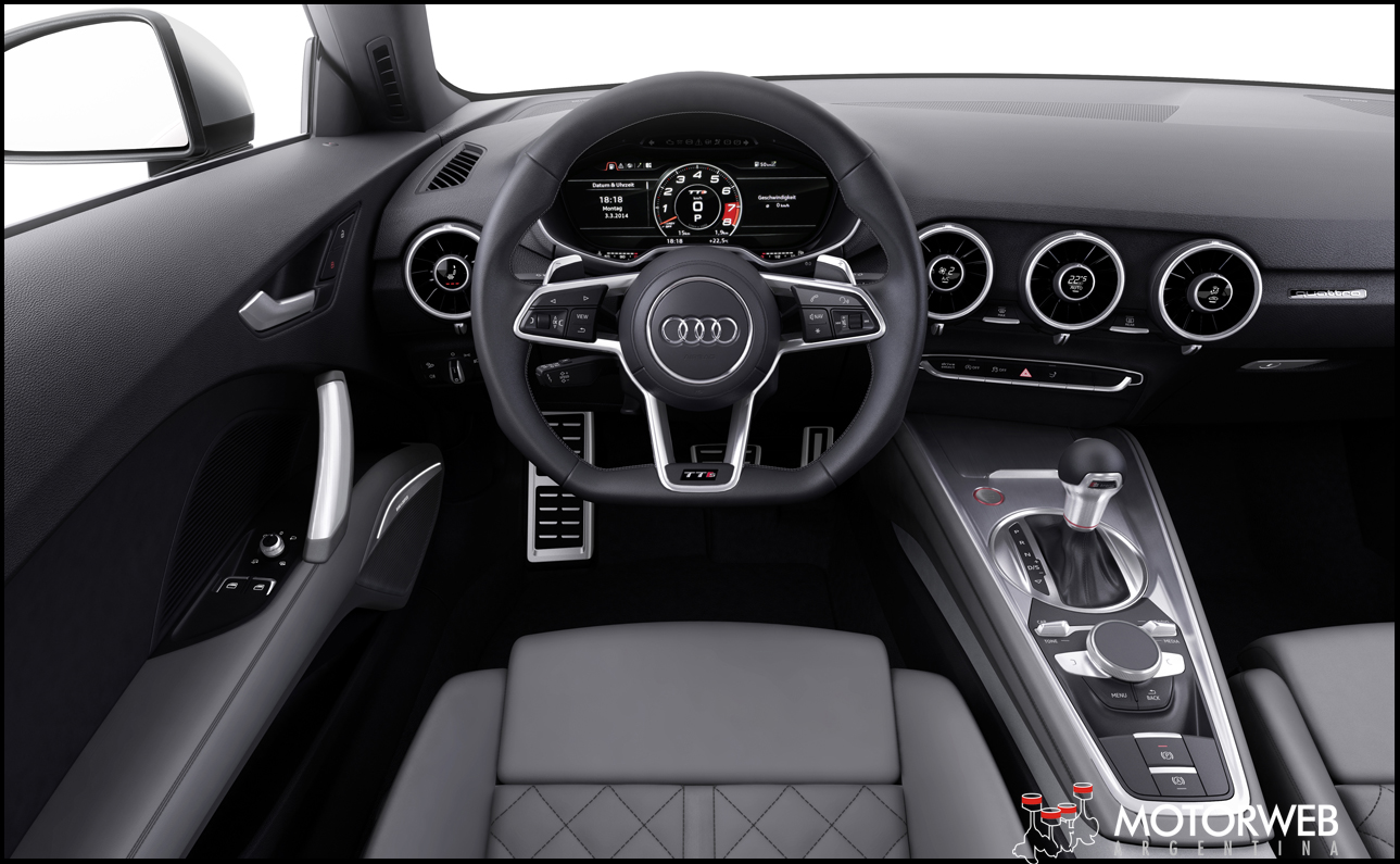 El interior del TT nuevamente es sinónimo de minimalismo y se refuerza la idea del «Menos es Mas». Con fuertes lineas horizontales que resaltan la sensación de anchura, el tablero entero se muestra muy moderno y tecnológico. El rasgo mas sobresaliente del nuevo «cockpit» es el nuevo cuadro de instrumentos, concentrado en un único display de 12,3 pulgadas diagonales que puede «dibujar» los instrumentos clásicos de aguja circulares, mostrar solamente un gran mapa del GPS, y en el caso del TTS, emular un gran cuentarevoluciones en el centro del display, bien a la usanza de los autos deportivos mas radicales. Esta pantalla ofrece una excelente resolución de 1440 x 540 pixeles.