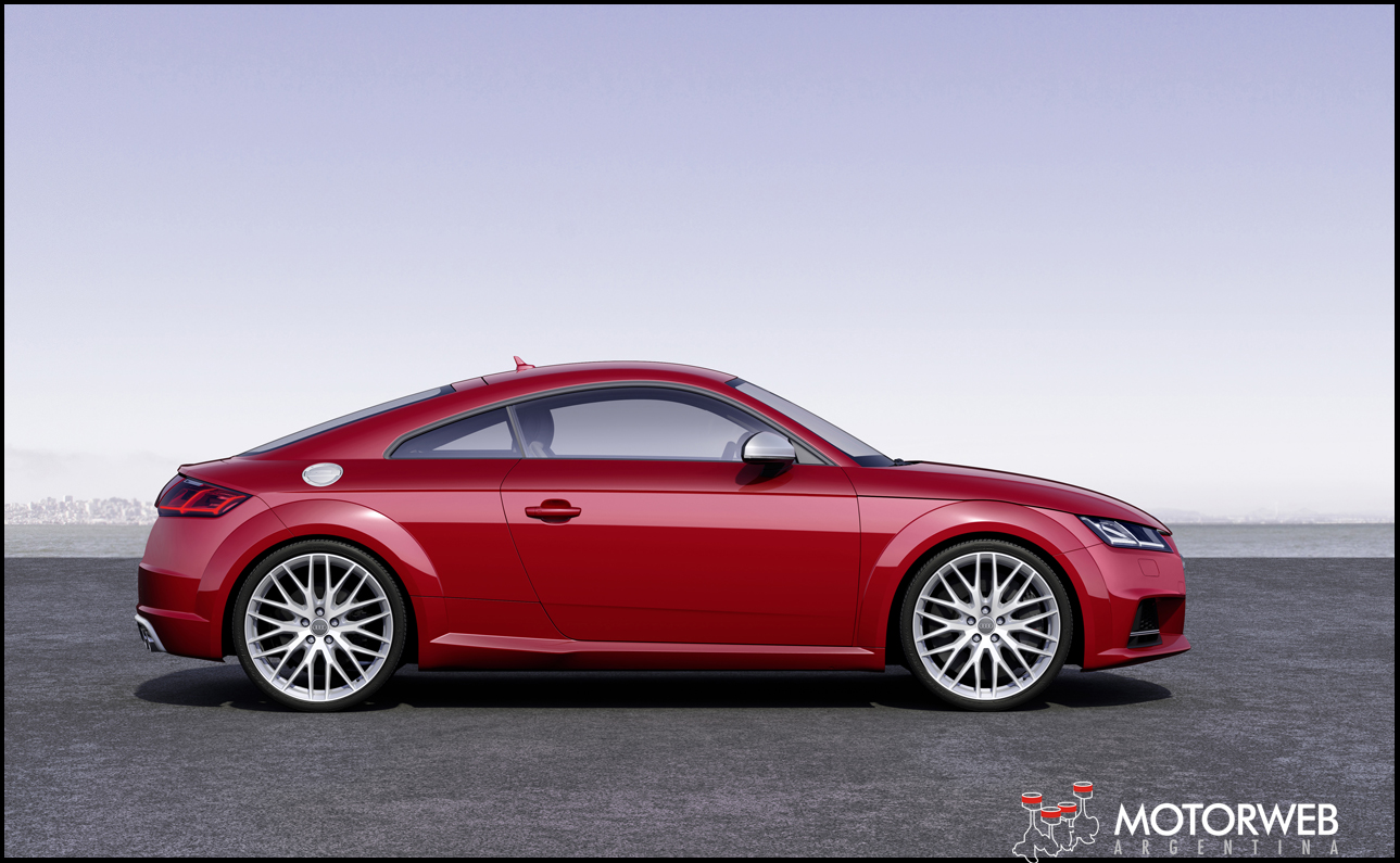 El aspecto lateral del nuevo TT es tan muscular como lineal y anguloso. Nuevamente están presentes los marcados pasarruedas redondos que le dan tanta expresión a los laterales. Si bien tiene el mismo largo que el modelo que reemplaza (4.18 m), parece mas largo, porque creció la distancia entre ejes, mejorando la habitabilidad. También el ancho y la altura del auto son iguales a la generación actual. También la tapa del tanque de nafta es otro guiño al diseño de la primera generación del TT.