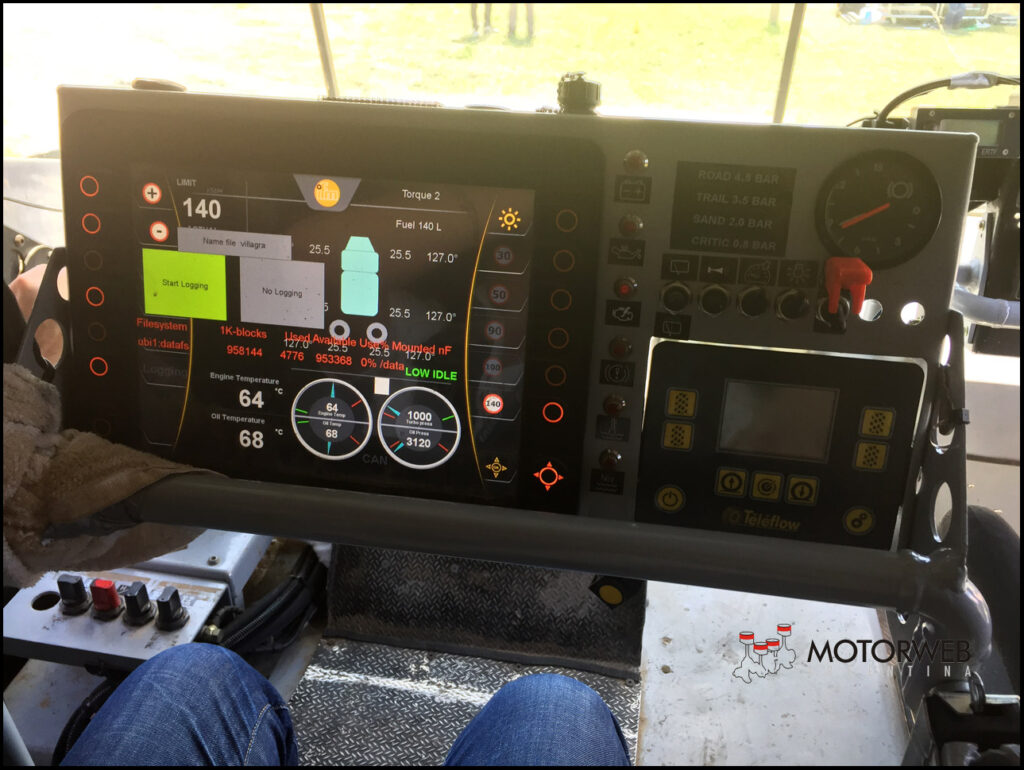 El increíble «aparato» al que nos subimos a girar unas vueltas a un pequeño circuito armado para mostrar las virtudes de esta mole con ruedas, monta un moto Iveco Cursor 13 con cerca de 900 CV, desarrollado por FPT Industrial para el rally Dakar. Es difícil entender como semejante camión se mueve por lomas y caminos escarpados con la soltura de un pequeño auto de Rally, pese a gran porte.