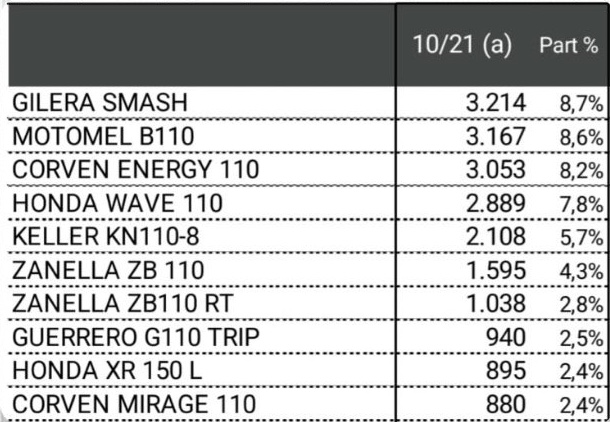 En cuanto a la participación, no se observan cambios de posiciones en los primeros tres puestos con respecto a los últimos meses. La Gilera Smash encabeza la lista de modelos. En tanto, Honda sigue liderando el mercado con 6.651 unidades, seguida por Motomel, que con 5.426 se afirma en el segundo lugar por noveno mes consecutivo. Y Corven, con 5.136 sigue en la tercera posición, por séptimo mes consecutivo.