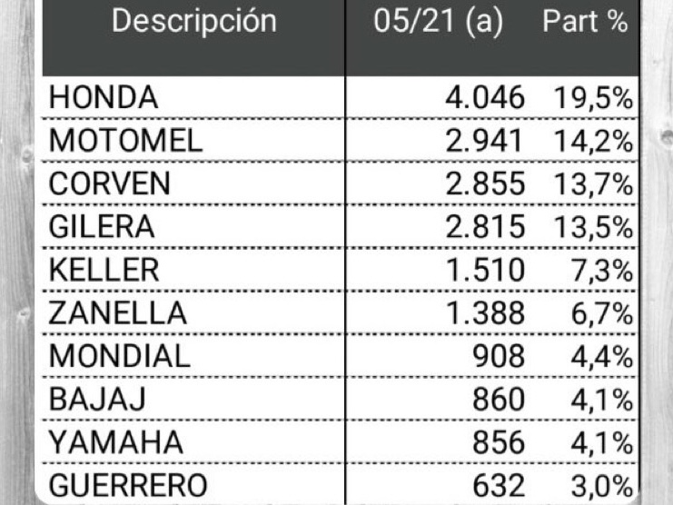 En tanto, Corven, con 2.885, recupera la tercera posición y deja a Gilera cuarta con 2.815 unidades. En el quinto escalón, está ahora Keller con 1.510, superando a Zanella con 1.388 motos patentadas.