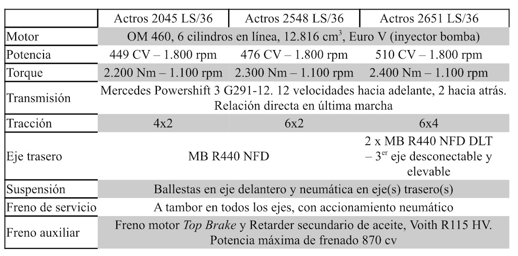 Las nuevas versiones son: Actros 2045 LS/36 4×2, Actros 2548 LS/36 6×2 y Actros 2651 LS/36 6×4. El Mercedes-Benz Actros es el camión más representativo de la marca por tamaño y rendimiento. Fue presentado por primera vez en 1996 en el Salón del Automóvil de Fráncfort. Reconocido cinco veces como el Camión Internacional del Año, tuvo un gran desempeño en todas sus generaciones. En la actualidad, es uno de los referentes en el transporte pesado de mercaderías por ruta.