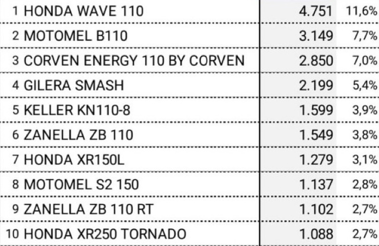Por otra parte, señalaron que prácticamente sin cambios en cuanto al modelo más patentado. Sigue liderando cómodamente la Honda Wave 110, histórica líder de años anteriores, segunda está la Motomel B110, en tercer escalón la Corven Energy 110 By Corven, seguida por la Gilera Smash y cierra los primeros cinco puestos de enero, la Keller KN 110-8.