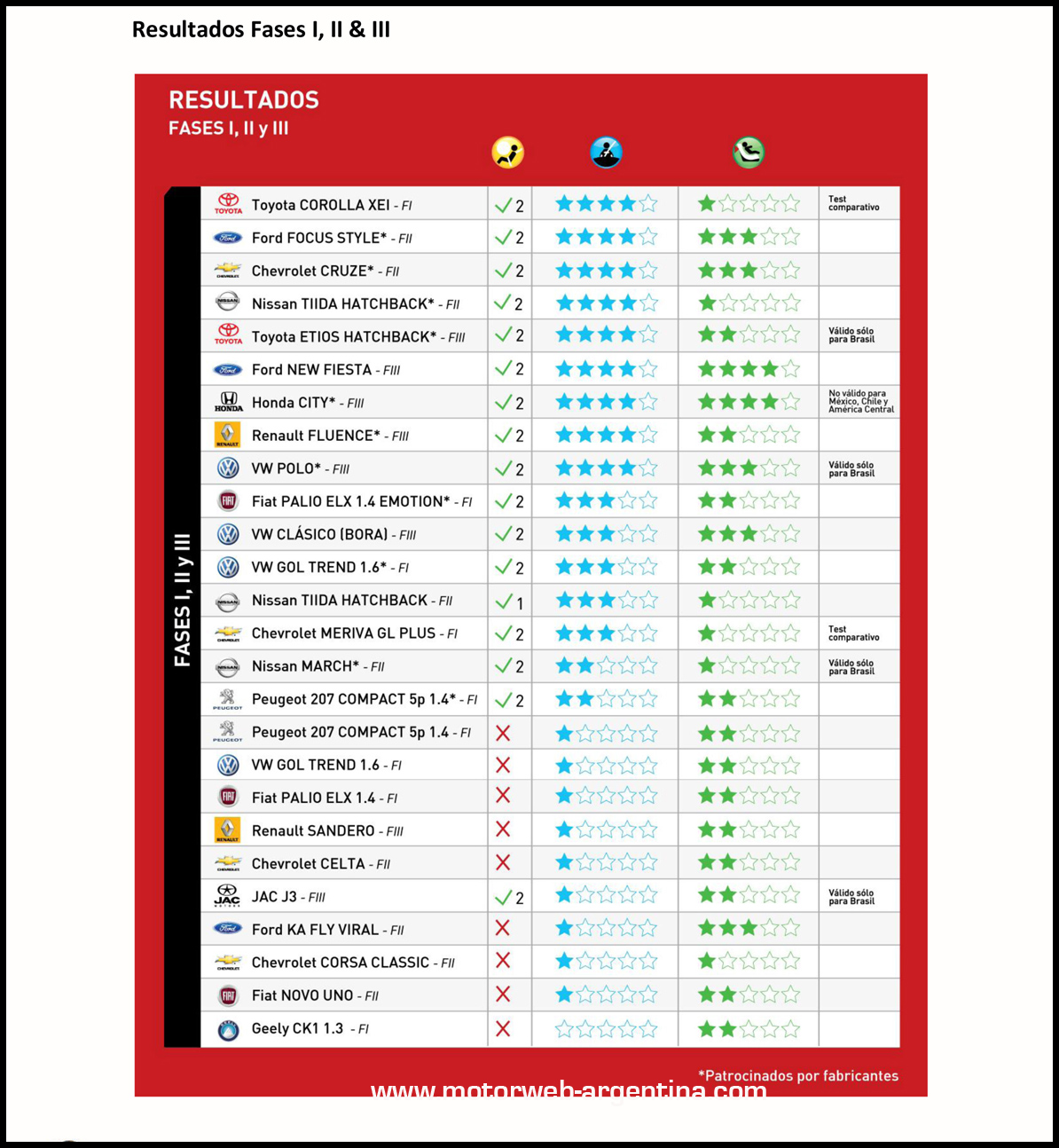 Es muy alentador en esta Fase III el significativo incremento en la cantidad de autos que obtuvieron cuatro estrellas. Cinco modelos obtuvieron cuatro estrellas evidenciando los beneficios combinados del mejoramiento de la fortaleza de la estructura, los airbags y los cinturones de seguridad. Los modelos que cuentan con cuatro estrellas son el Ford NEW Fiesta KD, Honda City, Renault Fluence, Toyota Etios hatchback y VW Polo hatchback. El otro modelo testeado, el Volkswagen Clásico/Bora obtuvo sólo tres estrellas debido a su pobre integridad estructural.