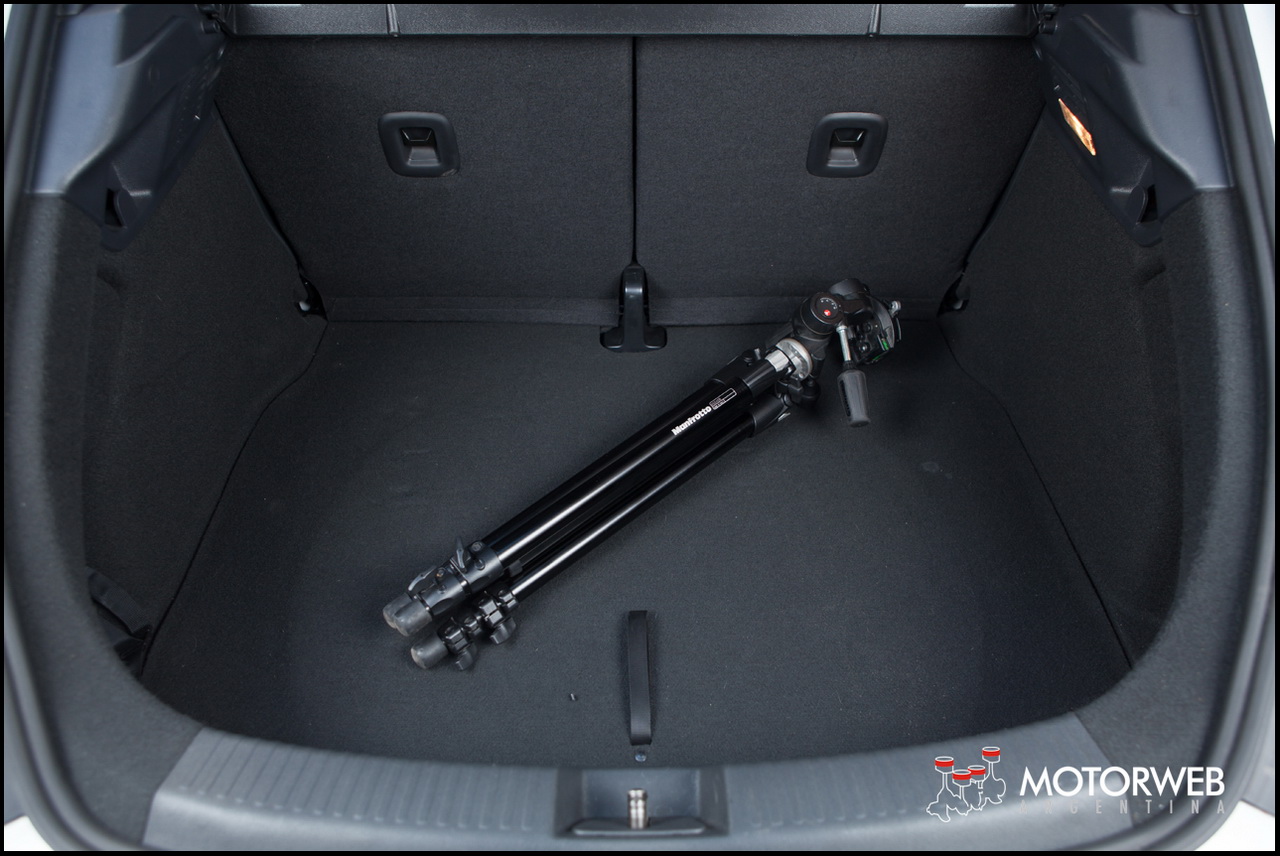 El baúl ahora tiene 310 litros de capacidad de carga, mucho mas amplio que los 209 litros que ofrecía la generación anterior. Los respaldos de los asientos posteriores son rebatibles cómodamente y en modo simétrico desde dos levas en el canto superior de los asientos. Bajo el piso del baúl, está la rueda de auxilio, que si bien en nuestra unidad de pruebas estaba reemplazada por un kit antipinchazos, en los autos en venta normalmente en el país, vienen con una rueda de chapa común con neumáticos en medida 16 pulgadas. Correctísima terminación y presentación del interior del baúl.