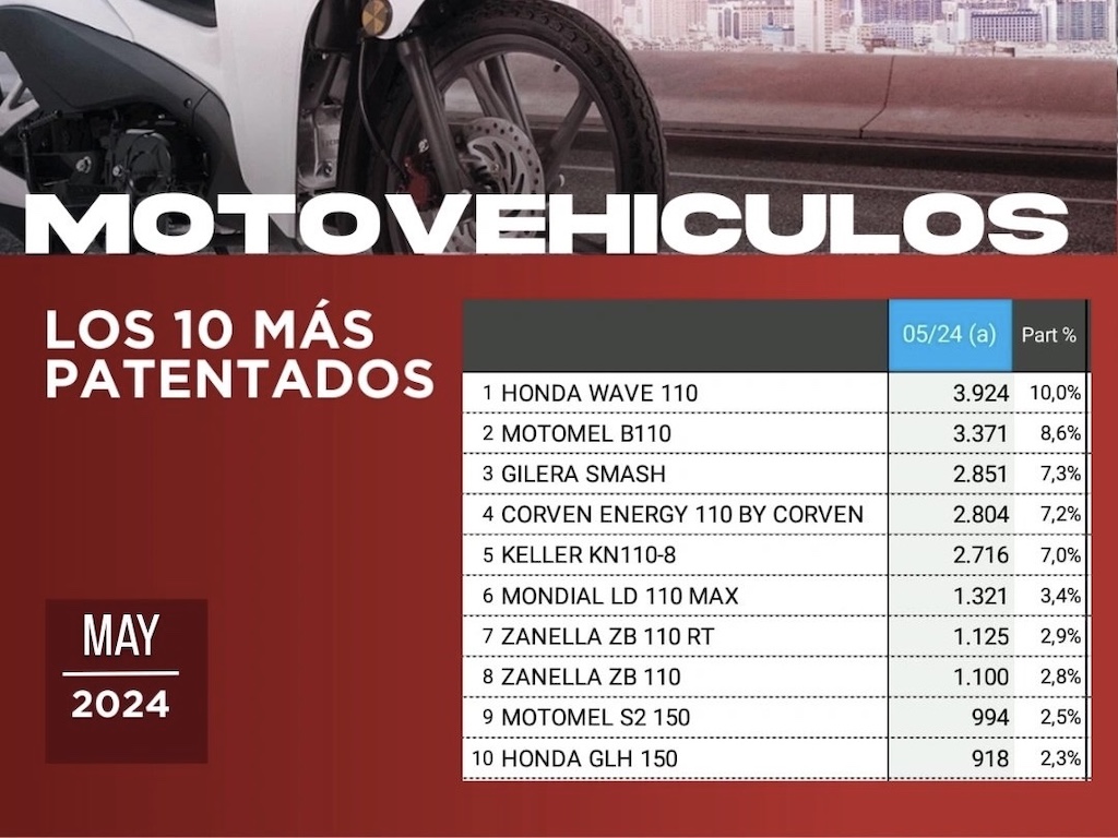 Sí hay algún cambio en cuanto al modelo más patentado: sigue liderando cómodamente la Honda Wave 110, histórica líder de años anteriores, segunda se ubica la Motomel B110, que había recuperado ese puesto en marzo, y la novedad es que escala a la tercera posición la Gilera Smash, que supera a la Corven Energy 110 by Corven, que quedó cuarta en mayo. La Keller KN 110-8, quinta, cierra el top five con muy pocas unidades de diferencia.