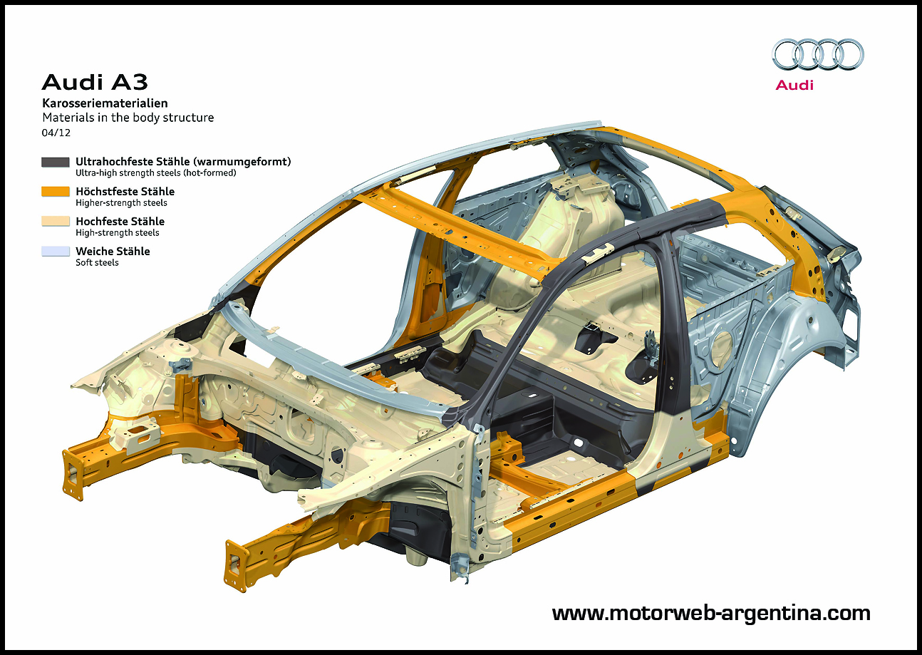 En el habitáculo del nuevo Audi A3 se emplean aceros de alta tecnología endurecidos en molde para reducir otros 18 kg de peso. El capot del motor se ha realizado en aluminio, con lo que se ahorran además más de 9 kg.