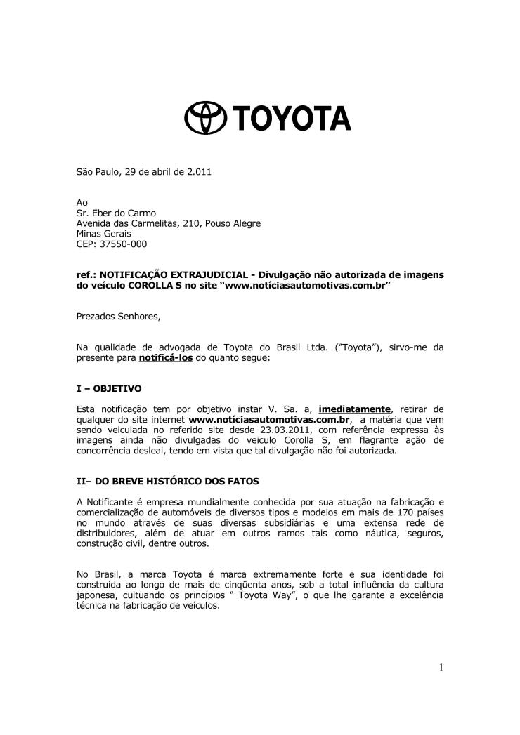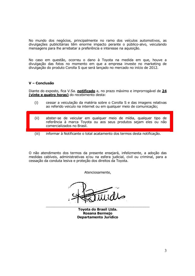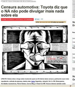 La réplica de la terminal japonesa fue enviar una nota al periodista de Noticias Automotivas intimándolo a no publicar nunca más noticias sobre Toyota, sus modelos o sus planes futuros, bajo pena de iniciarle acciones en el ambito judicial civil o criminal (?!). En un breve punteo dentro de la nota enviada, la Terminal de origen japonés alega estrategias comerciales violadas, de marketing e incluso habla de práctica comercial desleal.