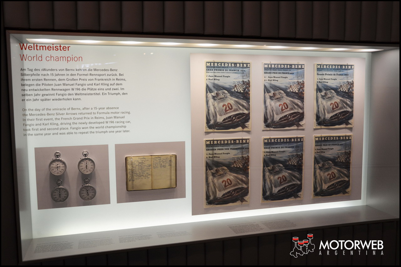 El recorrido del Museo Mercedes Benz culmina con una fantástica galería de autos de carreras en las mas variadas categorías. Por supuesto que hay un lugar de privilegio para la Fórmula Uno, y sus épicas Flechas de Plata que dominaron los circuitos en los años ’50. Para los argentinos que visiten el Museo, encontrarán no sólo autos de Fangio, si no tambien trofeos, y sus prendas de competición, como el buzo, guantes, botines y casco.