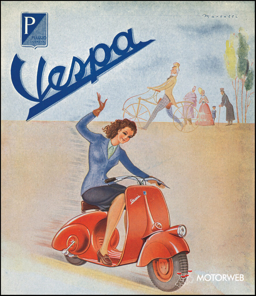 La presentación de las primeras 15 motos Vespa tuvo lugar en abril de 1946 en el Club de Golf de Roma. Los padres de la nueva moto eran el empresario Enrico Piaggio y el ingeniero aeronáutico Corradino D’Ascanio. Luego de varios proyectos, el ingeniero aeronáutico Corradino D’Ascanio diseñó un vehículo de aspecto revolucionario para su época: puso el motor sobre la rueda posterior e ideó el brazo delantero pensando en el tren de aterrizaje de un avión. Cuando Piaggio la vio, exclamó: «Bello, mi sembra una vespa» («Bonita, me recuerda una avispa», en italiano), aludiendo a la forma del vehículo: parte trasera más gruesa conectada a la parte frontal por una cintura delgada, y el manillar como las antenas.