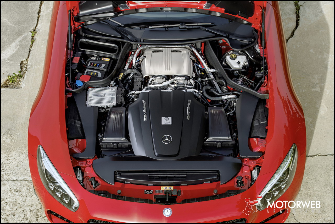 El motor V8 biturbo AMG de 4,0 litros, posee un desarrollo completamente nuevo. Apretando un botón se pone en marcha el nuevo propulsor de alto rendimiento, con un sonido como una inyección de adrenalina. El motor V8 biturbo de 4,0 litros ha sido desarrollado especialmente para el GT. Este innovador ocho cilindros es el miembro más reciente de la familia de motores BlueDIRECT y se distingue por su extraordinario despliegue de potencia, prestaciones al nivel de un auto de carreras, construcción ligera y alta eficiencia, así como gran compatibilidad medioambiental. Su sugerente e inconfundible sonido, típico de la marca, fascina tanto como su rápida respuesta y su elevada capacidad de aceleración.