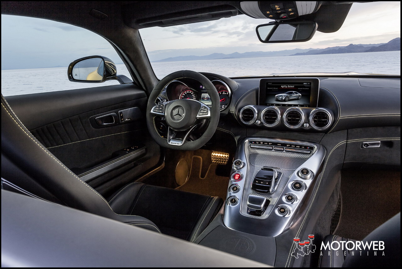 En el nuevo modelo se ha perfeccionado el leitmotiv del diseño de los deportivos Mercedes-Benz, un estilo inspirado en la construcción aeronáutica. El elemento dominante en el puesto de conducción del GT es el tablero de instrumentos extremadamente ancho, con vigorosa forma de ala. Esta impresión se refuerza con los cuatro difusores centrales para la climatización y los difusores individuales a izquierda y derecha. En combinación con la línea de cintura alta, las líneas cóncavas de los revestimientos interiores de las puertas y la dinámica consola central, el GT muestra rasgos de auténtico bólido de competición y envuelve sugestivamente al conductor, que ocupa una posición baja en su asiento.