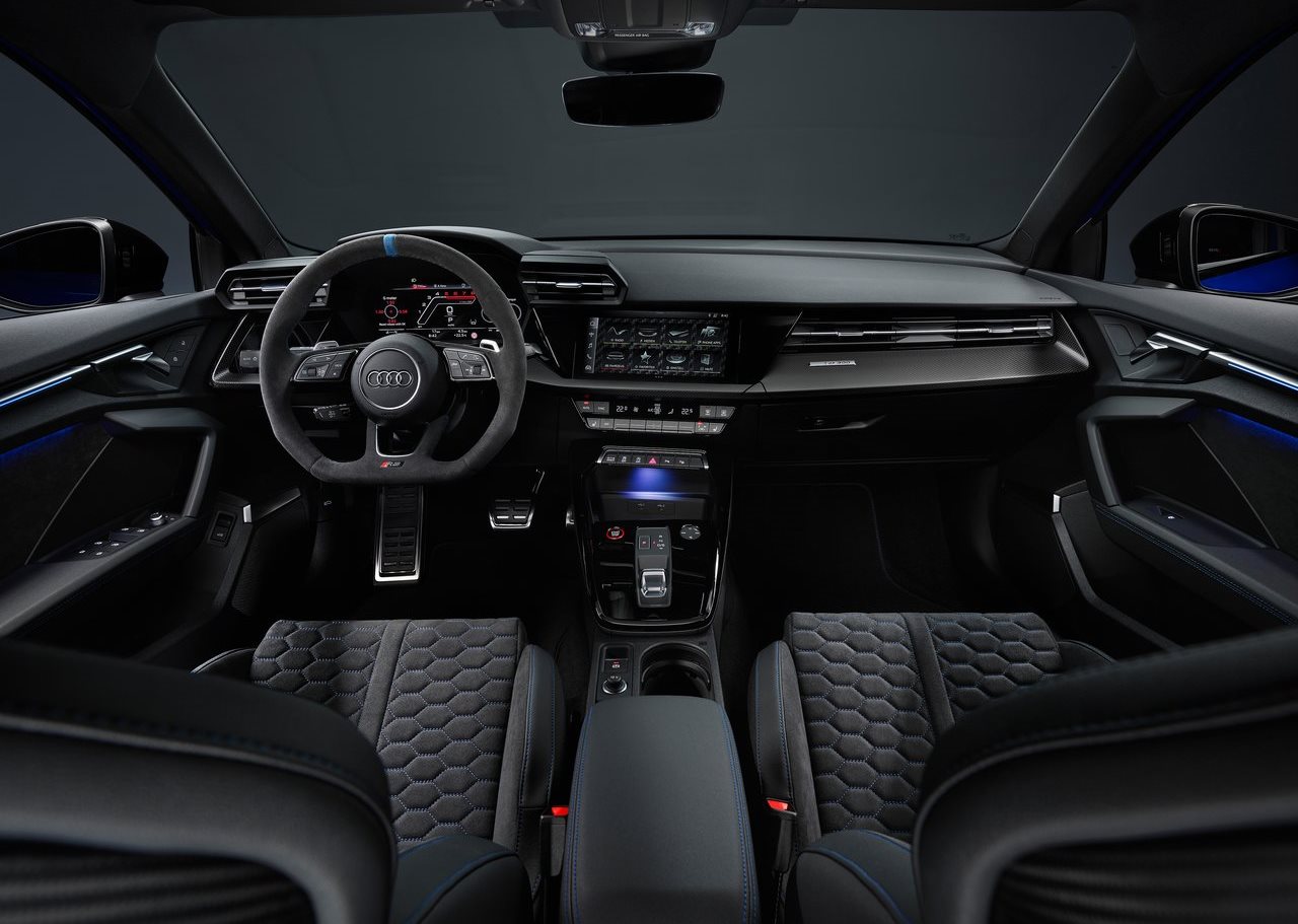 En el interior se destaca por contar con asientos tipo «Backet» de serie, que son un opcional en los RS3, meientras que se destacan otros detalles específicos, tal como el volante tapizado en Alcántara, con el agregado de costuras en color azul, al igual que todo el interior, o mismo los cinturones de seguridad al tono. El Europa el precio de lista de estos ejemplares exclusivos arranca en 75.000 euros.