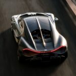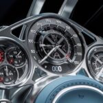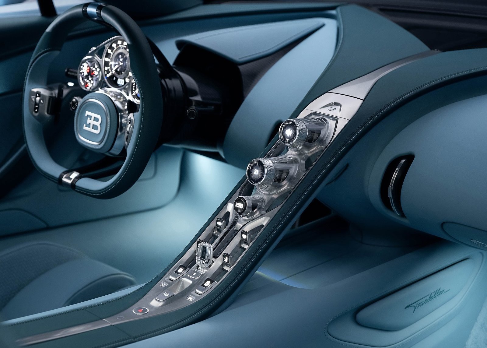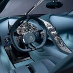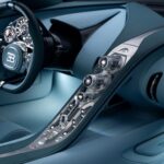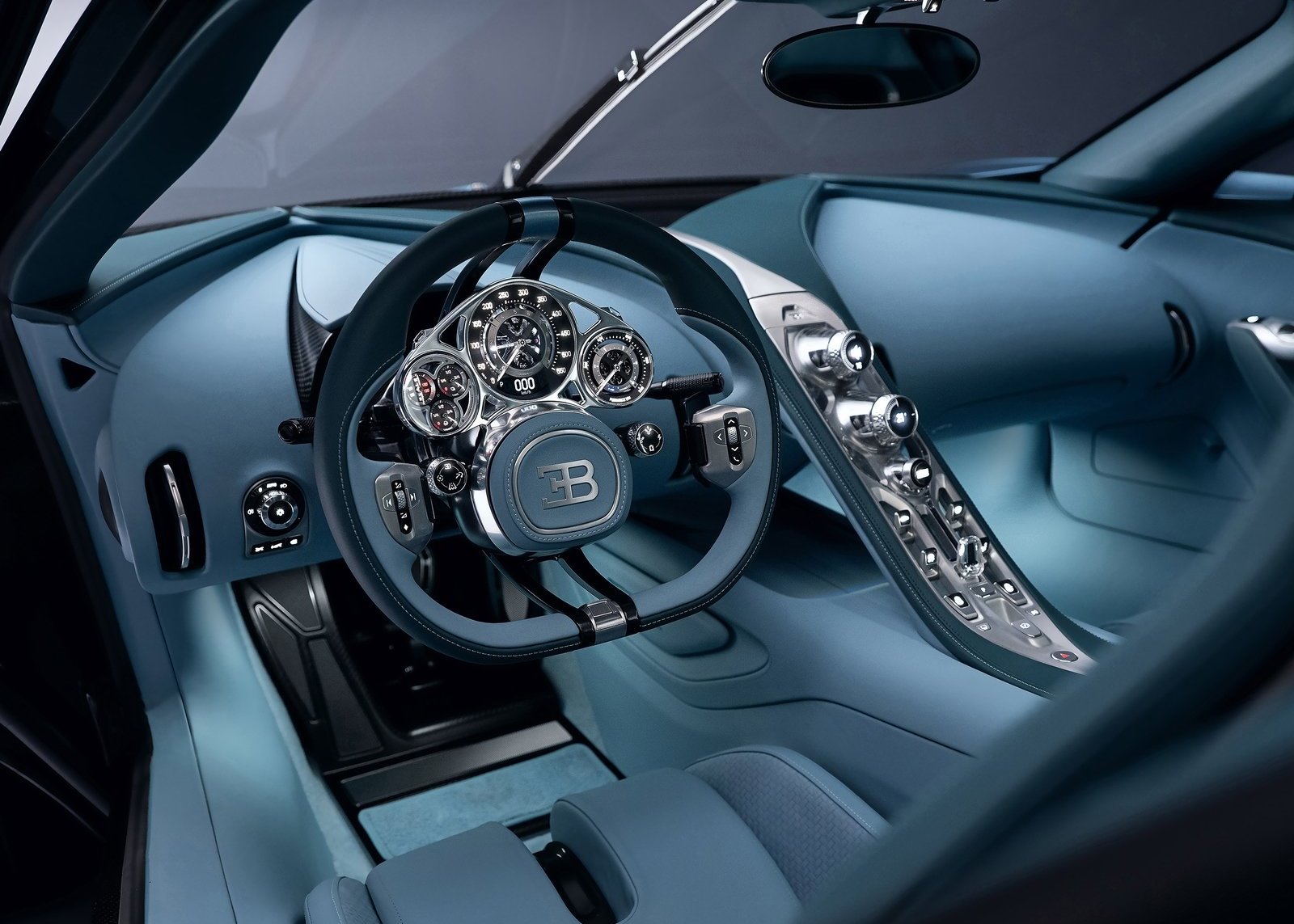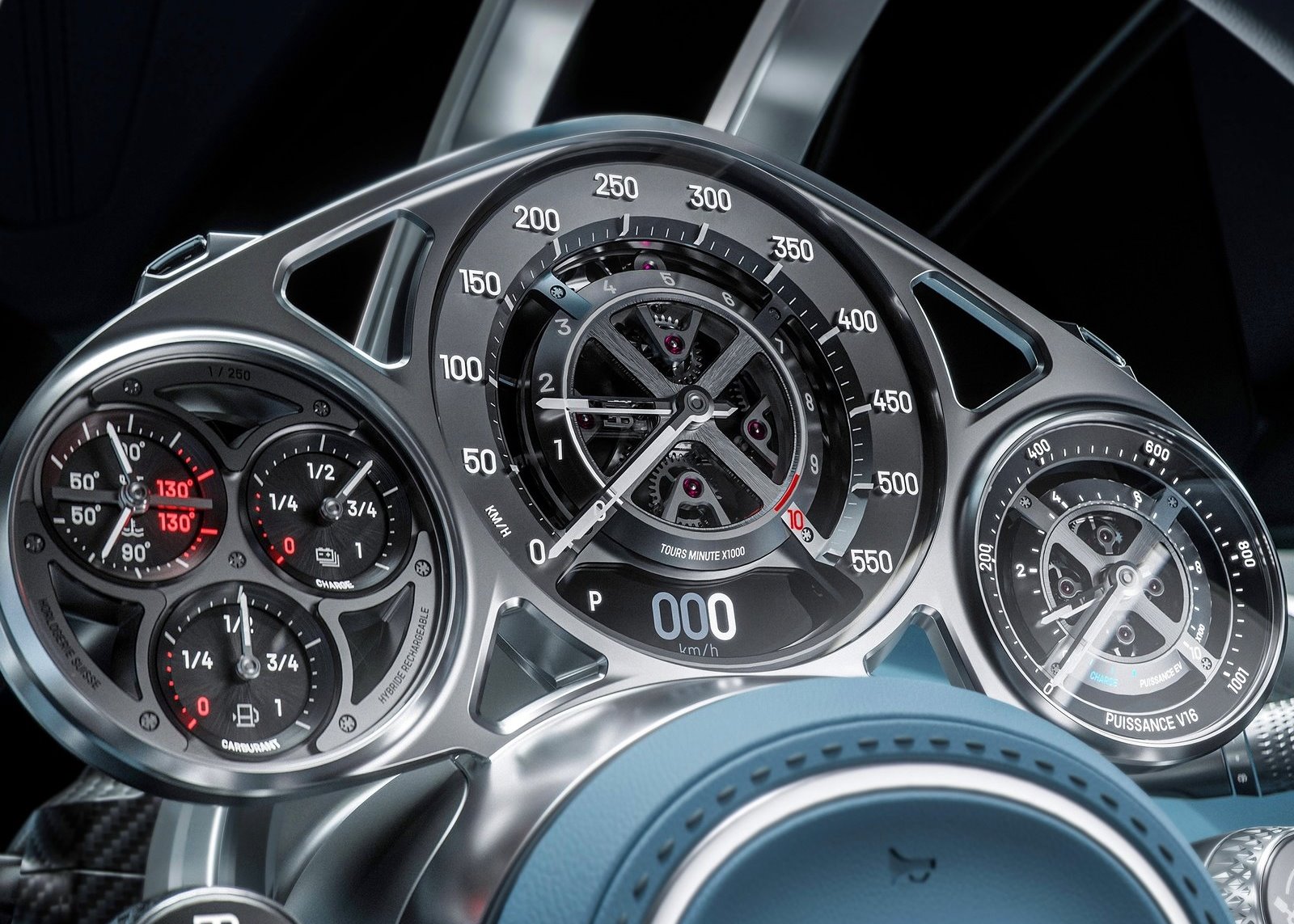 Otra obra de arte de este Bugatti está en el interior. Precisamente el tablero fue diseñado y construido con la experiencia de los relojeros suizos, y compuesto por más de 600 piezas. Emplea titanio y piedras preciosas como zafiro y rubí, el cúmulo esqueletizado está construido con la tolerancia más grande de 50 micrones, la más pequeña de 5 micrones, con un peso de solo 700 gramos. Esta obra maestra de intrincado diseño sigue siendo un punto focal de la experiencia de conducción, fijada en su lugar mientras el borde del volante gira alrededor de ella, una configuración conocida como volante de cubo fijo. Ah, eso tiempo atrás también lo vimos en el Citroën C4.