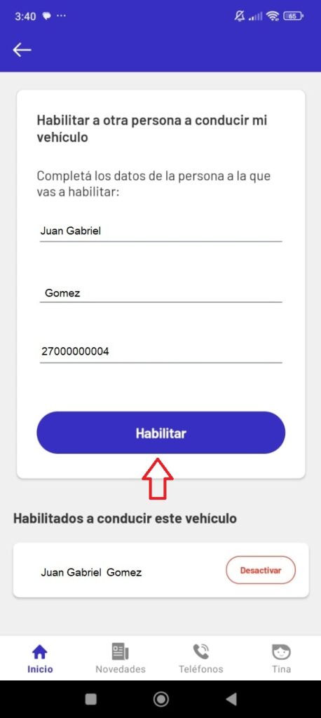 Allí figuran los dominios a nombre de cada persona. Entrando a cada uno de ellos, y colocando solo nombres, apellido y CUIT de la persona que se desee habilitar a conducir el trámite ya estará realizado.