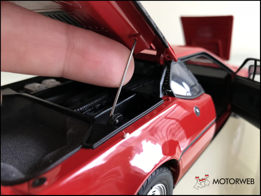La calidad de la pintura es correcta, así como los detalles menores como llantas, neumáticos, limpiaparabrisas, retrovisor. Incluso tiene un detalle genial, que son los faros delanteros efectivamente retráctiles. En el interior, se destaca el volante que actúa efectivamente sobre la direccion de las ruedas delanteras, así como la correcta representación de butacas, tablero y contrapuertas. Tambien suma alfombrado en felpa del piso del baul trasero, y del piso del habitaculo. Otro gran detalle.
