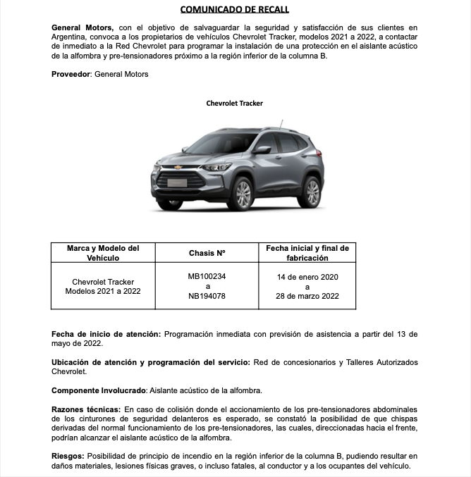 General Motors, con el objetivo de salvaguardar la seguridad y satisfacción de sus clientes en Argentina, convoca a los propietarios de vehículos Chevrolet Tracker, modelos 2021 a 2022, a contactar de inmediato a la Red Chevrolet para programar la instalación de una protección en el aislante acústico de la alfombra y pre-tensionadores próximo a la región inferior de la columna B.