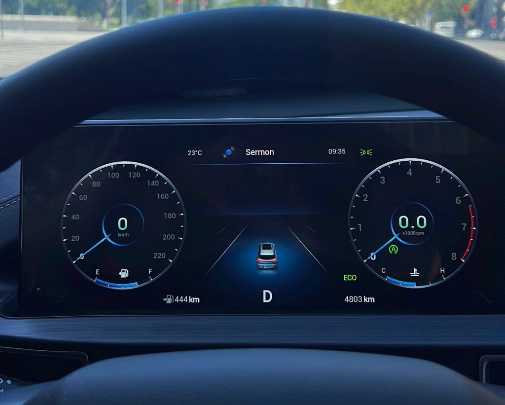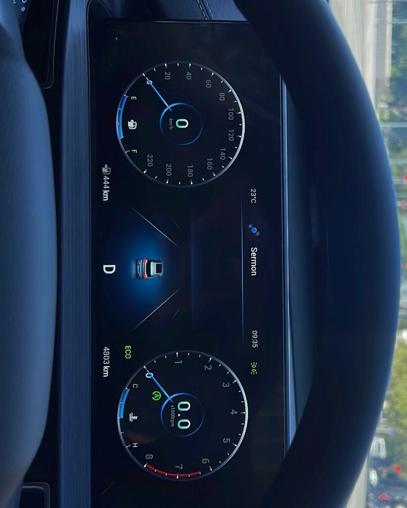 En cuanto al equipamiento, vamos con lo destacable: asientos de cuero, techo panorámico, climatizador de doble zona, carplay, luces ambientales, cargador inductivo, butacas eléctricas y velocidad crucero. Como dato curioso en la pantalla aparece un asistente virtual similar a Eve de Walle, que si lo presionás o le hablas, le podés pedir algunos comandos. Es más show que otra cosa, pero el “bichito” es simpático de ver.