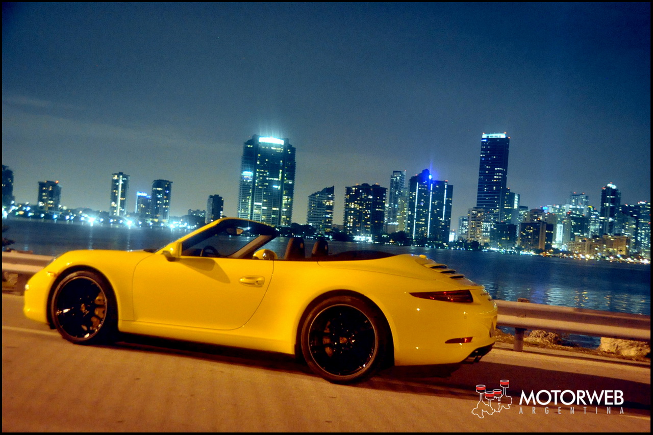 Como pueden apreciar en las fotos, el auto era un color muy llamativo, tal es así que incluso en las calles de Miami, donde es muy fácil encontrar circulando super-autos de todas las marcas, este ejemplar casi 0km con su distintivo amarillo «Racing», capota negra y llantas oscuras, captaba la atención de muchos curiosos. Tal es así, que en varias esquinas o estaciones de servicio era muy común ver señas de aprobación son el pulgar en alto, o directamente gente desde otros autos en los semáforos alabando el diseño del 911. Pero mas allá del costado narcisista que le genera a su conductor un 911 descapotable y amarillo por las calles de Miami Beach, vayamos a los aspectos técnicos y mecánicos de esta ultima generación del mítico 911, lanzado en formato Coupé en el Salón de Frankfurt en el 2011 (mirá nuestra cobertura especial acá), y como convertible en el Salón de París del 2012 (también estuvimos allí, leé esta nota).