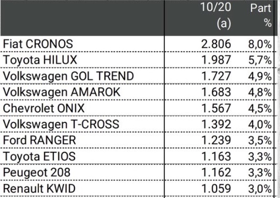 En el podio de los más vendidos le siguieron la pick up Toyota Hilux (1.987) y el Volkswagen Gol Trend (1.727). Luego la pick up Volkswagen Amarok (1.683), el Chevrolet Onix (1.567) y el Volkswagen T-Cross (1.392). Cierran el top ten la pick up Ford Ranger (1.239), el Toyota Etios (1.163), el Peugeot 208 (1.162), y el Renault Kwid (1.059).