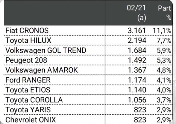 La venta de vehículos 0km durante febrero creció un 8,9% interanual, al sumar un total de 30.141 unidades. Así se ratifica la tendencia de los meses previos de recuperación del mercado local. El Fiat Cronos sigue al frente y Toyota se consolida de mayor participación.