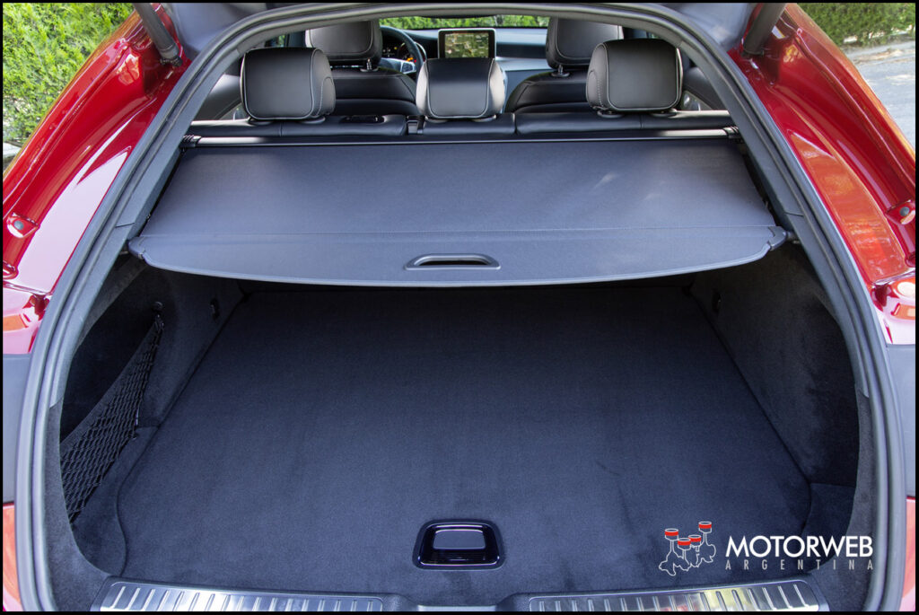 El volumen del espacio de carga es muy generoso a pesar de la línea baja del techo de coupé, con 491 litros, que si se rebaten completamente los respaldos del asiento trasero, se dispone en total de un volumen de carga máximo de 1.205 litros. La motorización corre por cuenta de un 4 cilindros, de dos litros de cilindrada, con turbo, que desarrolla 241 cv a 5.500 rpm. El torque máximo es de 350 Nm entre las 1.200 y las 4.000 rpm, con lo que el GLC 300 Coupé logra una velocidad maxima declarada por fábrica de 222 km/h y una aceleración de 0 a 100 km/h de 7.3 segundos.