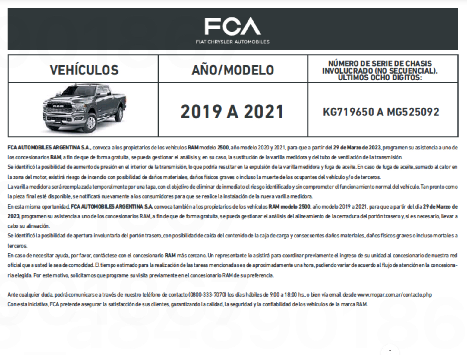 FCA AUTOMOBILES ARGENTINA S.A., convoca a los propietarios de los vehículos RAM modelo 2500, año modelo 2020 y 2021, para que a partir del 29 de Marzo de 2023, programen su asistencia a uno de los concesionarios RAM a fin de que de forma gratuita, se pueda gestionar el análisis y en su caso, la sustitución de la varilla medidora y del tubo de ventilación de la transmisión.