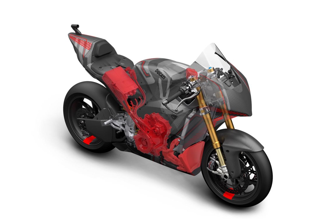 Entre los detalles técnicos, Ducati declara que el conjunto de baterías pesa 110 kg y ofrece una capacidad de 18 kWh. En su interior hay 1.152 celdas cilíndricas del tipo “21700”. El inversor, con un peso de 5 kg, deriva de un modelo de alto rendimiento en la competición de vehículos eléctricos, mientras que el motor (con 21 kg de peso y un régimen máximo de 18.000 rpm) fue desarrollado por una firma colaboradora siguiendo las características técnicas proporcionadas por Ducati.