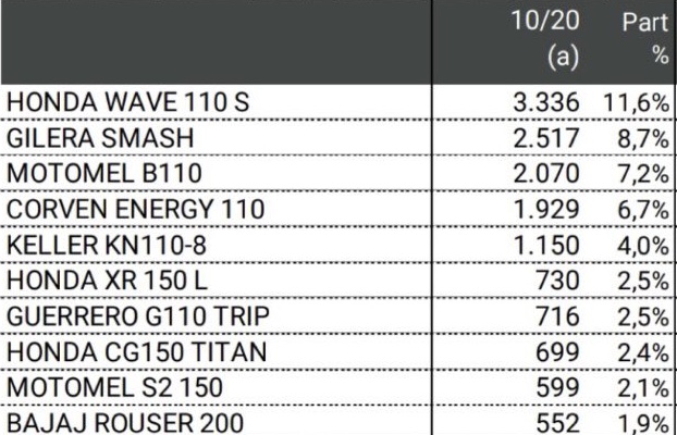 En cuanto al modelo más patentado, la Honda Wave 110S retoma el liderazgo que supo tener durante años, por segundo mes consecutivo, y envía a la Gilera Smash al segundo lugar, mientras que la Motomel B110 retoma la tercera posición.
