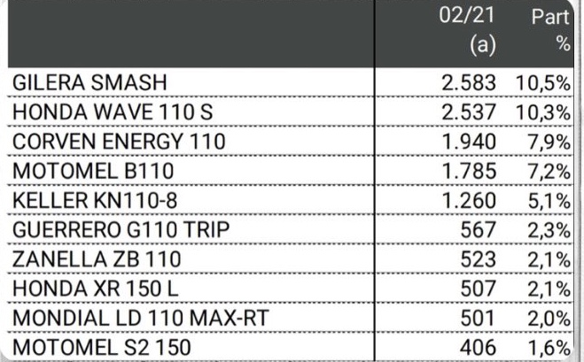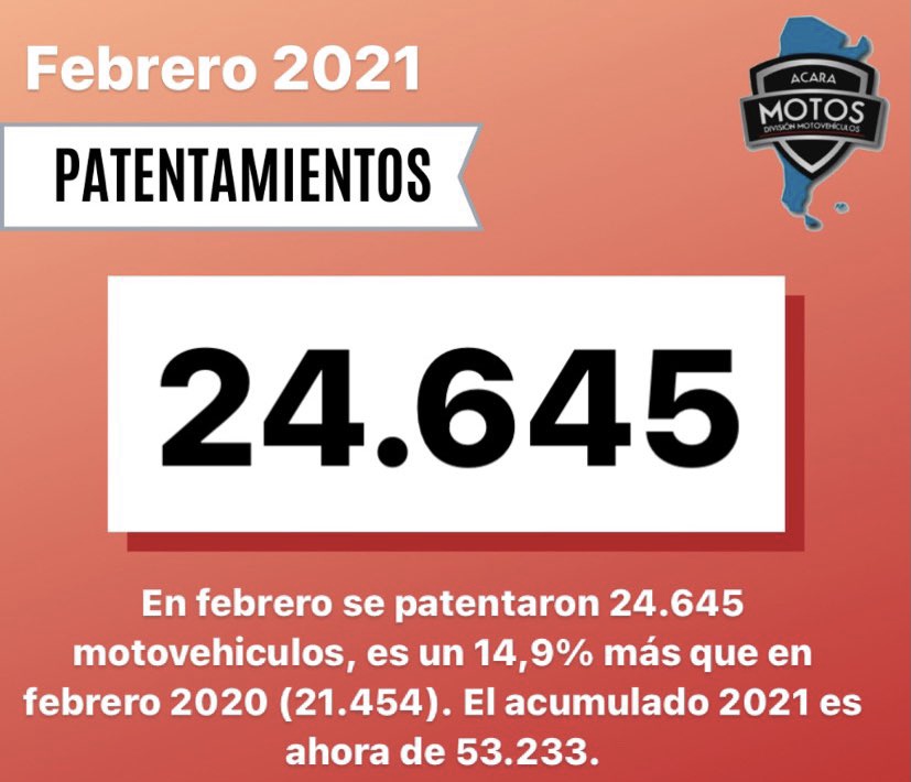 De acuerdo con el informe de Acara, el número de unidades patentadas durante febrero fue de 24.645 motovehículos. Es un 14,9% más que en el mismo mes de 2020, ya que en febrero de 2020 se habían registrado 21.454 unidades.