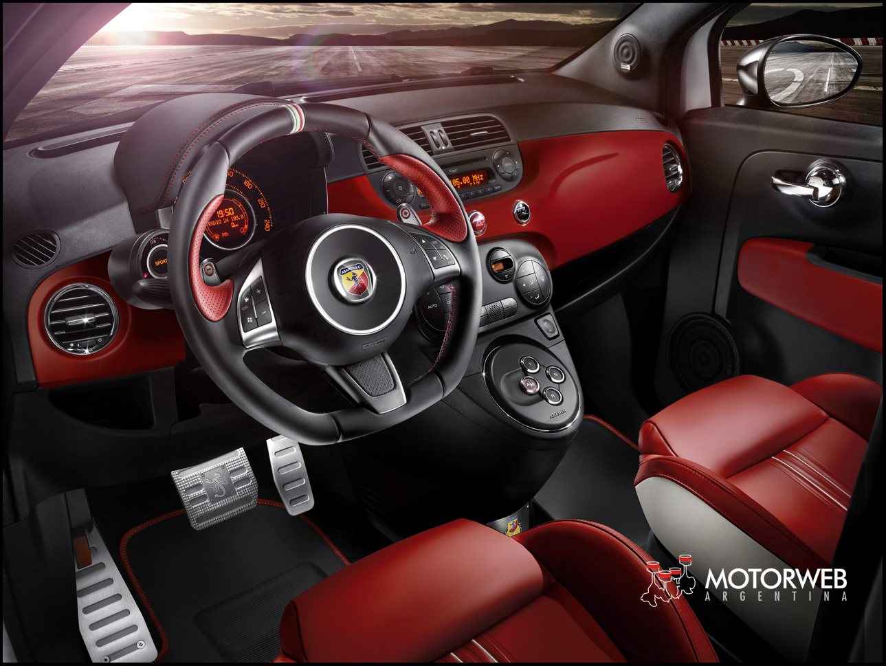 El interior también se personaliza y demuestra todo el cuidado de los detalles y la deportividad del exclusivo 595 50 Aniversario. También los asientos deportivos en cuero rojo con aplicaciones blancas y costuras rojas, combinados con la plancha, son una reinterpretación moderna de los asientos del vehículo original. Además, el logo histórico adorna tanto el volante en piel negra con aplicaciones rojas y centro embellecedor como las cantoneras, otorgando al vehículo una modernidad atemporal.