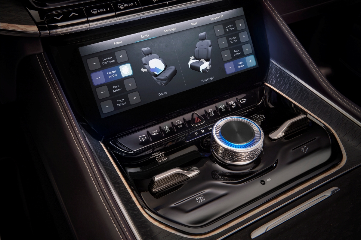 Esta franja de vidrio de ónix parece flotar sobre una placa estructural de aluminio sin procesar. También exhibe, por todo el panel de instrumentos y en las puertas delanteras, incrustación 3D de madera de sicómoro, tratada térmicamente, y la palabra Grand Wagoneer inscrita en aluminio en el panel de instrumentos del lado del acompañante.
