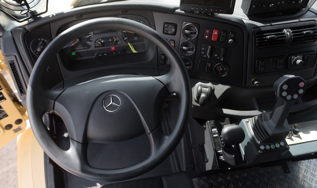 Según la marca de la estrella, su concepción como vehículo todoterreno se basa en la interacción perfecta de los componentes del tren de rodaje, que garantizan una conducción segura y ágil sobre cualquier superficie. “Su movilidad es sobresaliente gracias al concepto de cabina con capó y a la distribución equilibrada de la carga entre los ejes. Su estructura frontal asume una importante función de protección, evitando daños y suciedad en el parabrisas. Ademas, cuanta con una óptima transmisión de la fuerza gracias a su cambio automático Allison con convertidor de par que proporciona un avance perfecto”, agrega.