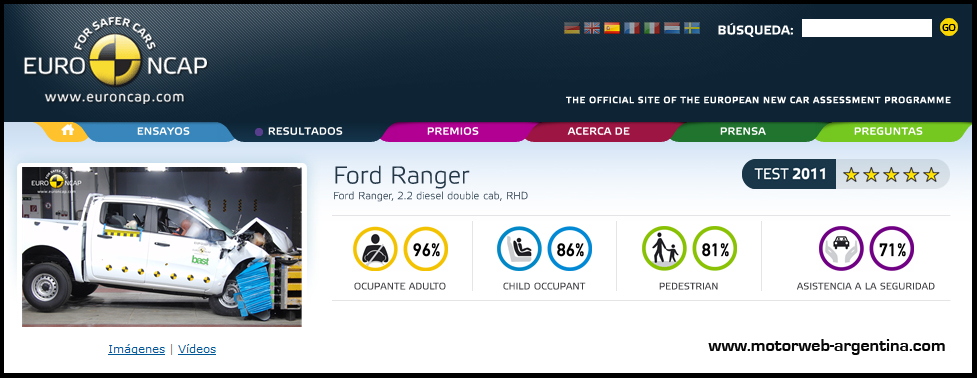 La futura Ranger que veremos fabricarse en Argentina, ya va introduciéndose en mercados europeos y es por ello que la entidad independiente Euro NCAP la sometió a sus severos exámenes de evaluación de choques. Así, la Ranger, logró las cotizadas 5 estrellas en terminos de seguridad.