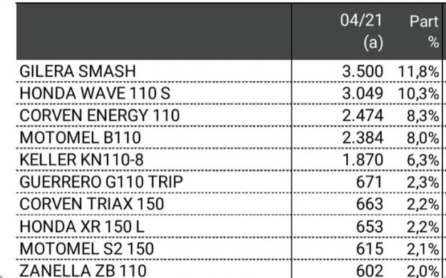 En cuanto a las marcas con mejor desempeño en ventas de motos en abril, sigue liderando el mercado con 5.715 unidades. Le sigue Corven, que pasó del cuarto al segundo escalón con 4.190 unidades. Luego Motomel, que estuvo dos meses segunda, y retoma ahora al tercer puesto con 4.139. Gilera baja un puesto y está ahora cuarta con 4.025 y Keller cierra los cinco primeros con 2.137.