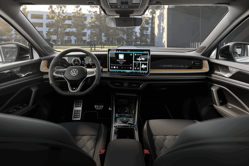En su interior cuenta con techo panorámico, tapizados en cuero perforado. Las butacas delanteras tienen regulación eléctrica con memoria y están equipados con ventilación, calefacción y masajes con 10 funciones. El cockpit con insertos “R-Line” retroiluminados, “Head-up Display” que proyecta información del tablero en el parabrisas, molduras R-Line en zócalo de puertas delanteras de ingreso al habitáculo, pedalera con apliques símil aluminio y consola central “R-Line”.