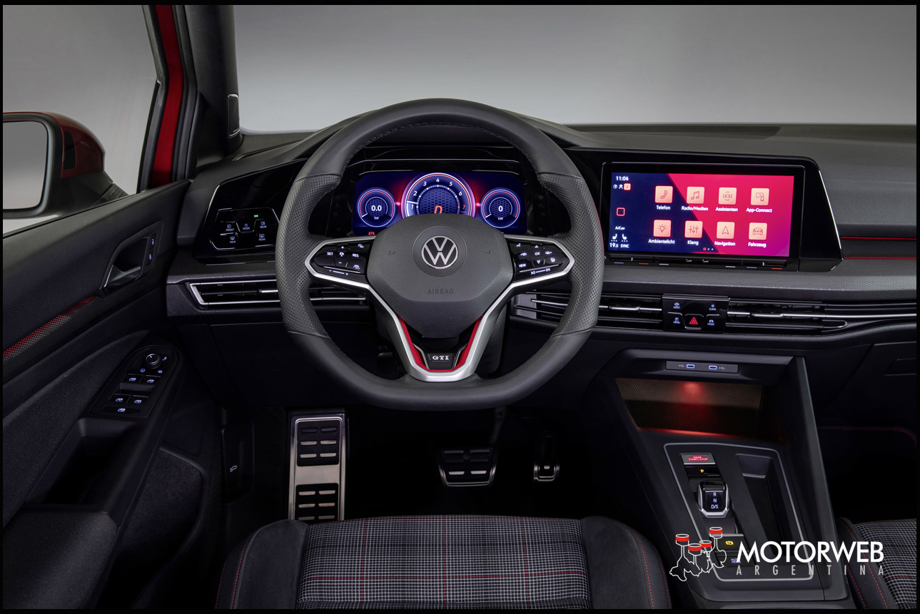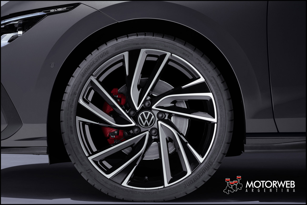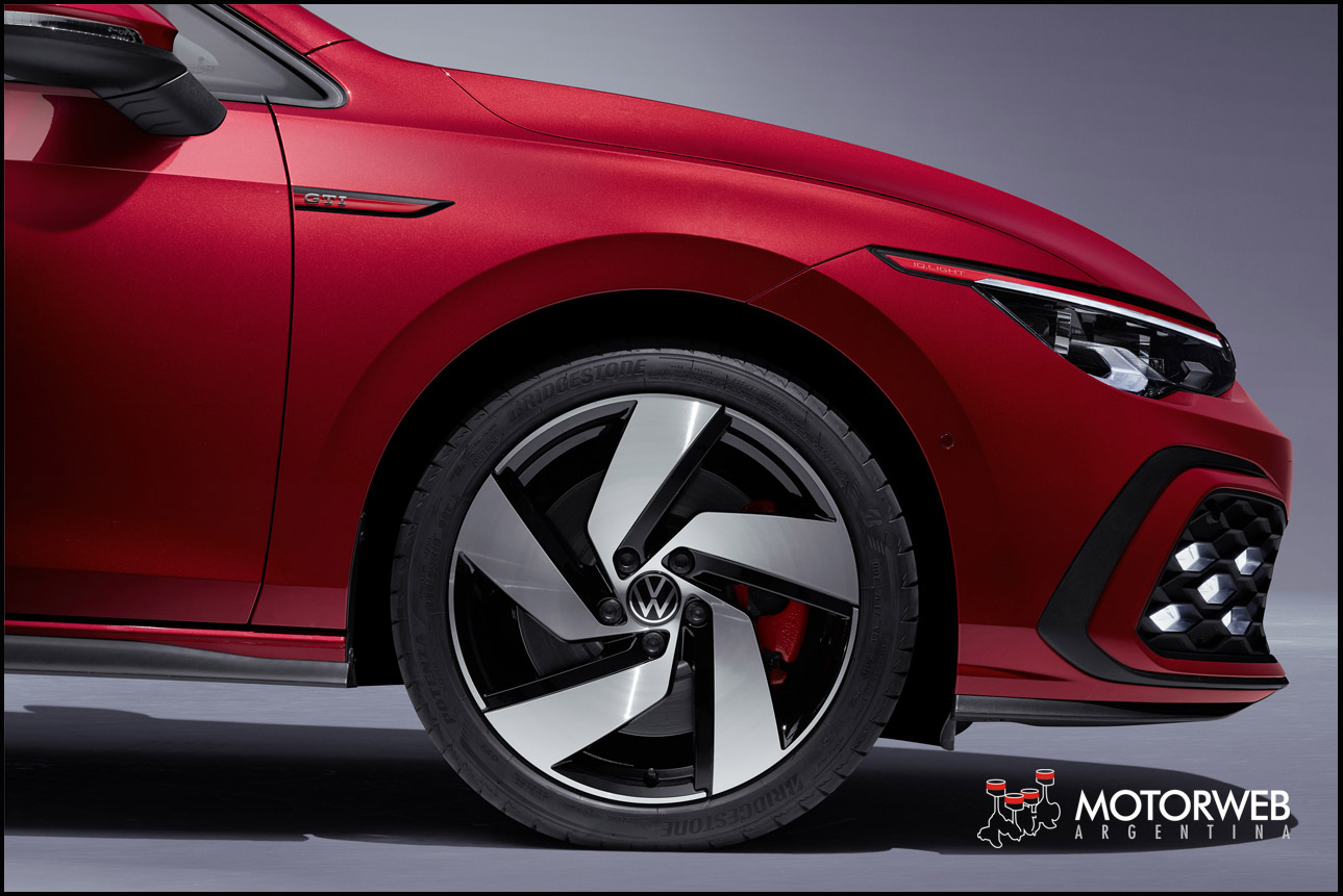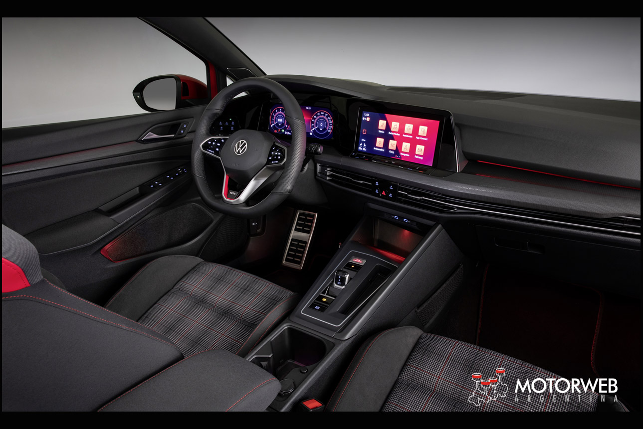 El equipamiento ampliado. En cuanto al exterior y como ya se ha comentado, el equipamiento se ampliará con las llantas de aleación de 17 pulgadas, una parte frontal específica, un difusor trasero graneado, un espóiler del borde del techo independiente, los logotipos correspondientes sistemas de tubo de escape individuales, pinzas de freno pintadas en rojo y ampliaciones de los faldones laterales. Desde el punto de vista funcional, forman parte de este equipamiento un tren de rodaje deportivo (solo GTI y GTD; 15 mm más bajo), así como el sistema de arranque y cierre sin llaves «Keyless Access» y la correspondiente ambientación luminosa. En el interior, se fusionan la versión superior del «Digital Cockpit» (varias configuraciones de pantalla) y el sistema de navegación de 10 pulgadas para formar el «Innovision Cockpit». El color y el gráfico del «Digital Cockpit» se adapta al modelo correspondiente. En muchos otros detalles, las versiones GTI, GTE y GTD del Golf se diferencian por los colores específicos que están asignados a cada propulsión, al igual que sucede en el exterior: rojo (GTI), azul (GTE) y plata (GTD). Los pedales siempre son de acero inoxidable.