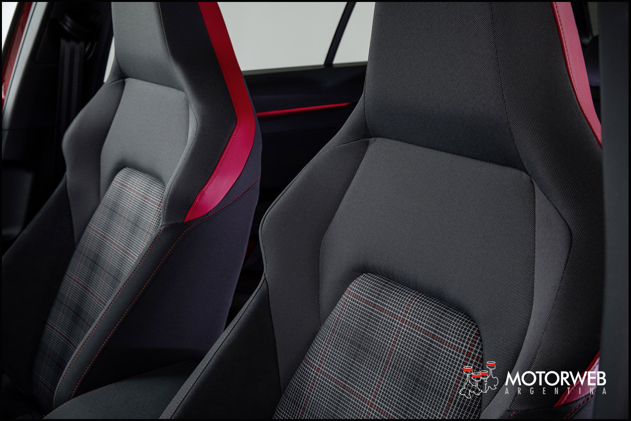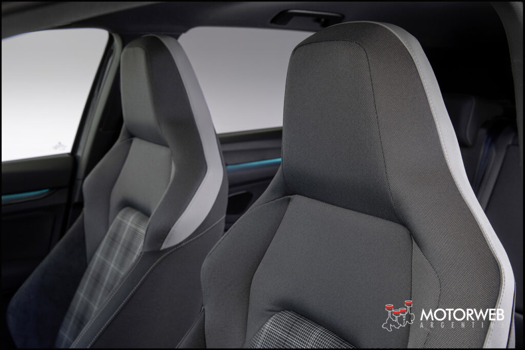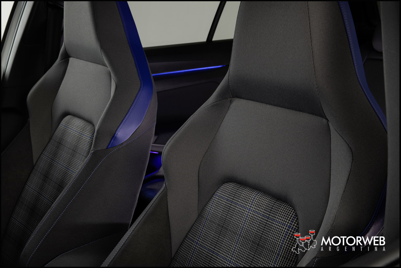 A partir del volante deportivo de antaño, se ha creado un nuevo volante deportivo de cuero multifunción con superficie táctil y la tecla «Travel Assist» integrada opcionalmente, que hace posible que los modelos potentes del Golf sean conducidos con asistencia a velocidades de hasta 210 km/h. Se conservan los tres radios de color plata. En el GTI, el embellecedor central está acabado con un elegante interior rojo; en el GTE, esta zona es de color azul y en el GTD, de color plata. Además, el clásico diseño a cuadros de los asientos deportivos es crucial. El nuevo diseño a cuadros se llama «Scalepaper». En el GTI, las costuras de los cuadros de color gris-negro son rojas; en el GTE, azules; y en el GTD, grises claras. Además, todas las costuras decorativas y los bordes son rojos, azules o negros en función del modelo.
