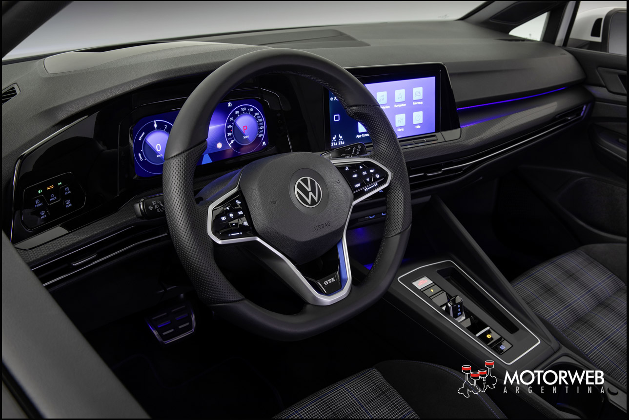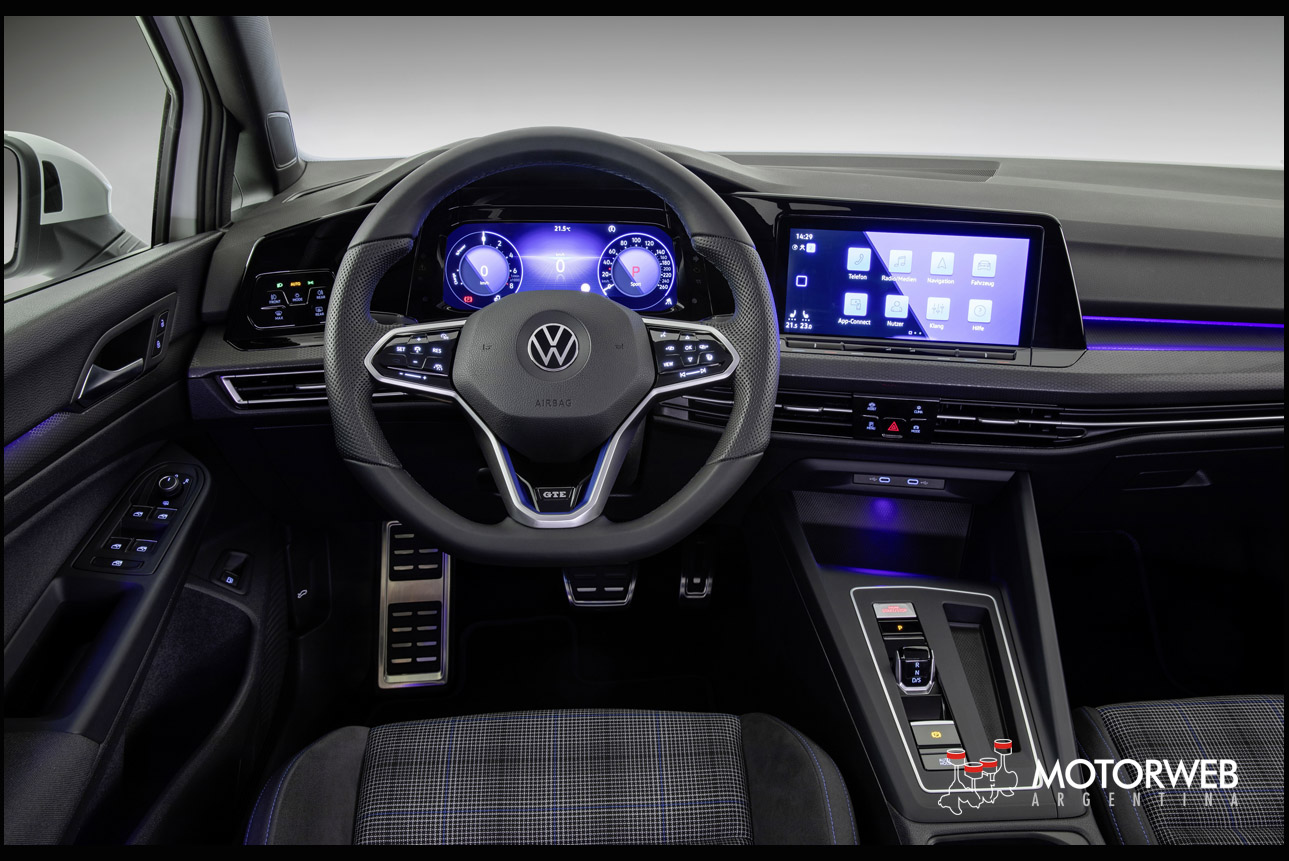 En concordancia con los nuevos tiempos. Al abrir las puertas se inicia el sistema «Innovision Cockpit» en los Golf GTI, GTE y GTD. Es una fusión de la versión superior del «Digital Cockpit» de 10,25 pulgadas (instrumentos digitales) y de un sistema de navegación de 10 pulgadas. Mediante la fusión óptica y funcional de ambas pantallas se obtiene una arquitectura completamente digital. La luz ambiental, también de serie, sumerge los indicadores y todas las otras zonas iluminadas del interior (tablero de instrumentos, guarnecidos de la puerta, portaobjetos con interfaz para teléfono móvil y zona reposapiés) en un espectro de 30 colores configurables libremente.