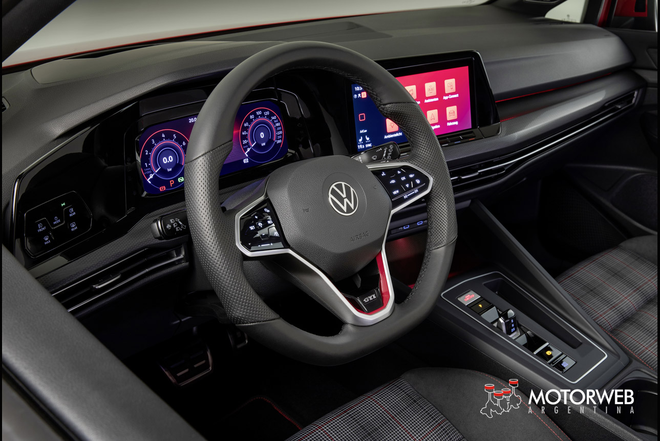 Dinámica distintiva. Desde el debut del primer Golf GTI, este vehículo se adapta como unos vaqueros perfectamente ajustados. Desde el principio, Volkswagen creó elementos inconfundibles de la dinámica con los detalles del interior: el volante deportivo con tres radios dobles de color plata y el símbolo de Wolfsburgo empotrado, el pomo de la palanca de cambios en forma de una pelota de golf negra, los asientos deportivos del GTI con un diseño a cuadros y laterales negros; todo ello ya hace tiempo que se considera de culto. Sí, a la historia; sí, al futuro. A pesar de que Volkswagen ha digitalizado e interconectado el Golf 8 y, con él, los modelos GTI, GTE y GTD, a un nivel sin precedentes y, de este modo, lo ha catapultado al futuro; todavía se conservan muchos de los distintivos originales.