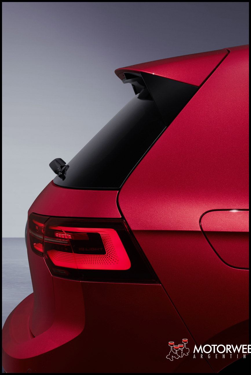El lateral también destaca por sus llantas de aleación de 17 pulgadas del tipo «Richmond» de serie. Si se desea, las llantas pueden ser de 18 o 19 pulgadas. Las pinzas de freno de todos los nuevos modelos deportivos del Golf están pintadas en rojo. Además, el GTI y el GTD llevan un sello con sus tres letras en el lateral de la aleta delantera. El GTE prescinde de él, pero, en su lugar, tiene una tapa de alimentación adicional para cargar la batería en el lado del acompañante. Los faldones laterales más anchos en negro, diseñados a modo de separador como se estila en el deporte automovilístico, caracterizan los tres modelos. Los spóilers delanteros se moldean hacia delante y el difusor, hacia atrás. En la parte superior de la silueta, un spóiler individualizado prolonga la línea del techo. Un elemento de diseño del lateral particularmente marcado es, en este caso, el pilar C característico de todos los Golf, que dinamiza la carrocería hacia delante y transfiere el icónico gráfico del Golf original y del Golf GTI al presente. Parte trasera superlativa.