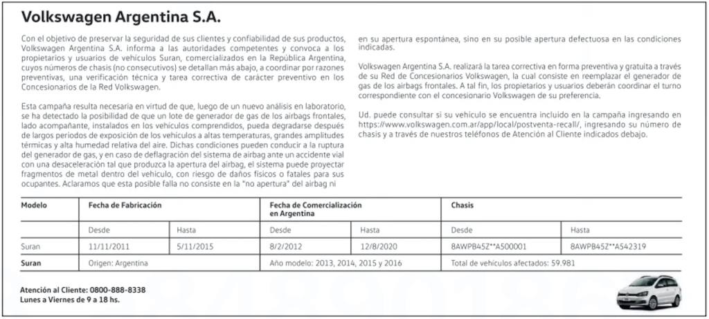 Volkswagen Argentina S.A. anunció un recall para su modelo Suran. Se trata de una convocatoria para unidades producidas en Argentina entre 2011 y 2020 por problemas en los airbags. Hay casi 60 mil vehículos afectados. A continuación el comunicado oficial de la marca.