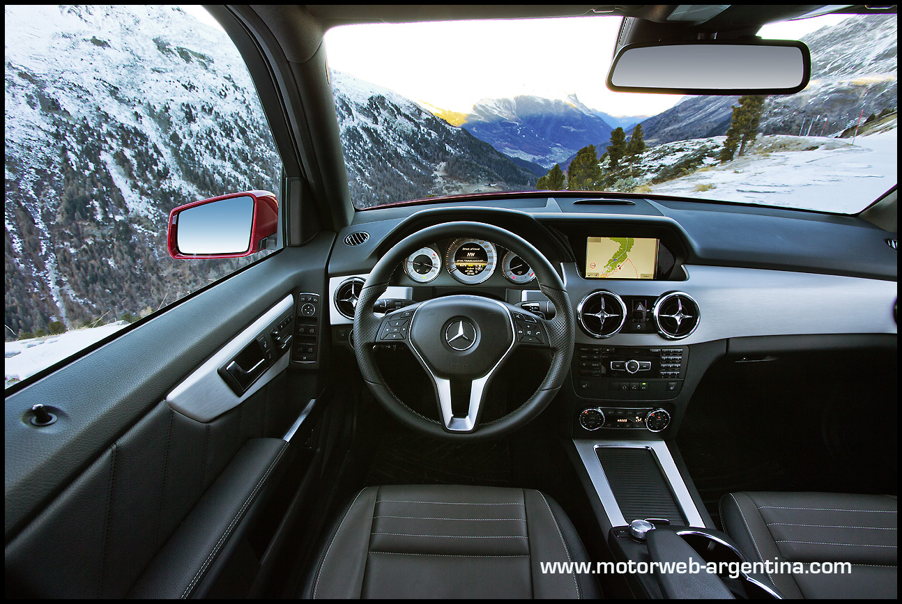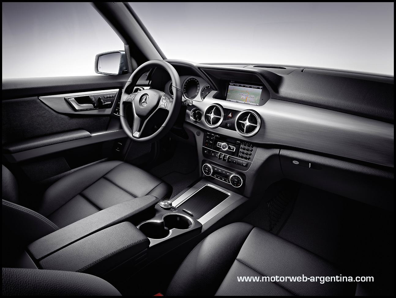 El diseño, la impresión de valor y la selección de materiales en el habitáculo remodelado del GLK alcanzan el nivel de las categorías superiores. Los interioristas del estudio de diseño de Mercedes-Benz en Sindelfingen han creado un tablero de instrumentos completamente nuevo: una moldura de amplia superficie de aluminio abarca toda la anchura del vehículo. También destacan los nuevos difusores redondos y otros elementos decorativos en silvershadow. En el cuadro de instrumentos se integra un display en color de alta calidad. El volante multifunción deportivo de tres radios y el tapizado de símil de cuero ARTICO subrayan el ambiente de bienestar del habitáculo al igual que la iluminación de ambiente en tecnología de diodos luminosos y fibra óptica, disponible por primera vez en el GLK (versión Sport). Los modelos equipan el cambio automático de siete velocidades 7G-TRONIC y su palanca selectora DIRECT SELECT se monta ergonómicamente en el tubo de cubierta de la columna de dirección. De ese modo, la consola central queda libre para conformar un compartimento portaobjetos con tapa de tipo persiana y reborde en silvershadow.