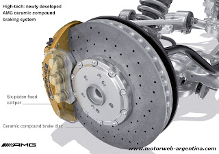 Para frenar a semejante artefacto, uno de los atributos más distintivos de este AMG son los frenos de compuesto cerámico de alta resistencia a la fatiga, que soportan incluso el uso intensivo como puede ser el de uso en pista. Los tremendos discos de freno de 402mm al frente y 360mm atrás se ocupan de frenar a este Gullwing en distancias imposibles para un auto “normal”. Las ruedas se componen de llantas forjadas de 10 rayos en 19 pulgadas adelante y 20 atrás. Los neumáticos son en medida 265/35 y 295/30, respectivamente.