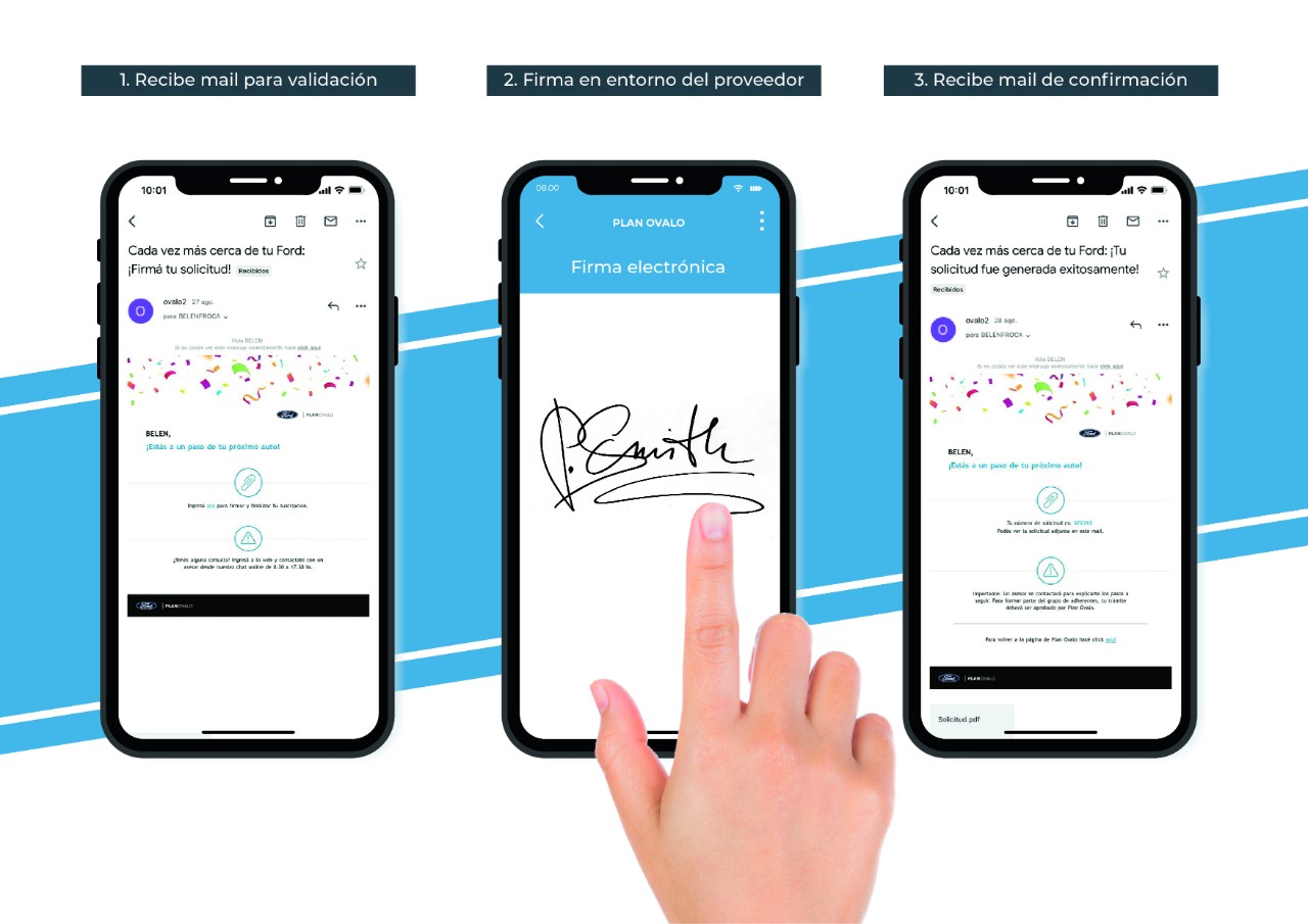 Ford propone a sus clientes la opción de comprar un plan de ahorro 100% online. La novedad, a través de la nueva firma electrónica, los clientes de Plan Óvalo podrán suscribirse y hacer el seguimiento de su plan en cuatro simples pasos y de forma totalmente digital. Se registran en Plan óvalo; eligen un plan; abonan la primera cuota y firman su suscripción desde cualquier dispositivo móvil con pantalla táctil. Esta tecnología también estará disponible en la Red de Concesionarios Ford. Ofrecerá a sus clientes la posibilidad de enviarle la suscripción completa vía e-mail y que la firmen, sin necesidad de acercarse al local.