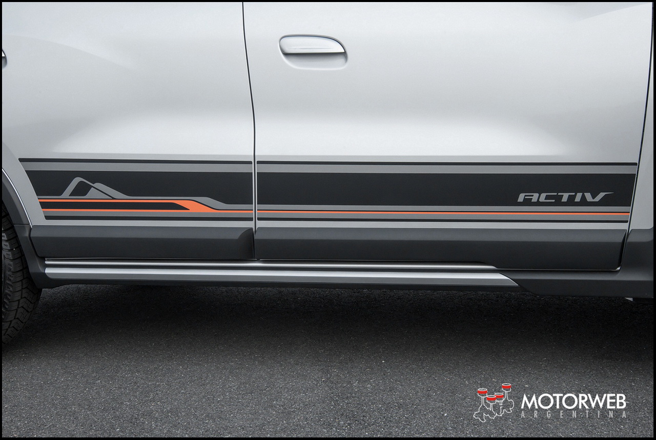 Esta versión aventurera incluye nuevos paragolpes, parrilla con marco cromado, estribos laterales, apliques en los guardabarros, rieles portaequipajes, faros delanteros y traseros con mascara oscurecida, espejos exteriores con acabado negro brillante, manijas de puerta color carrocería, llantas de aleación de 16”, antena de techo, identificación Activ e interior distintivo, propio de esta versión.
