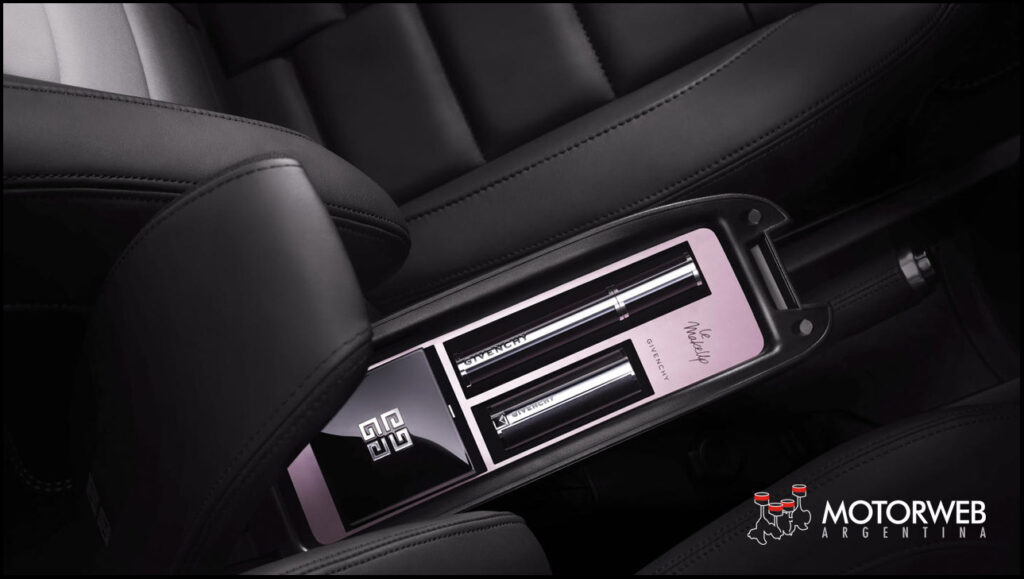 El conjunto de detalles que definen su interior se concentran en una presentación de la plancha frontal terminada en una delicada tonalidad rosa anodizada. Incluye las alfombras con el logo estampado y, a tono con esta versión, en los parasoles, con espejos de cortesía equipados con exclusiva iluminación. El apoyabrazos central en cuero y con impresos en grabado láser el logo de la Maison–, cumple las veces de un necessaire funcional. En una sutil combinación, que retoma el color rosa anodizado de la pancha frontal, viene incluido un kit de productos GIVENCHY que es parte del equipamiento de serie: una máscara de pestañas Noir Couture, unos polvos compactos Prisme Visage y un rojo de labios Le Rouge.
